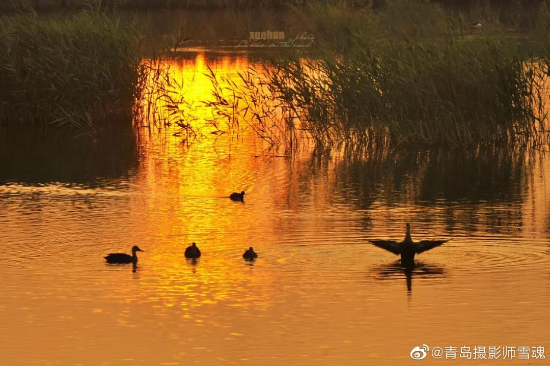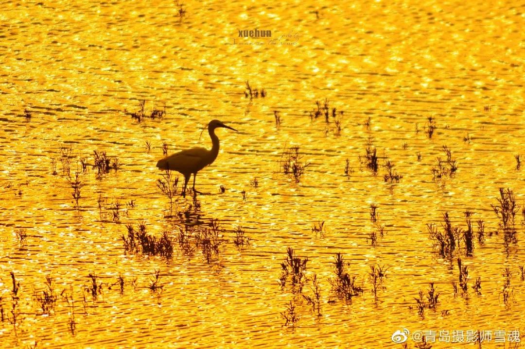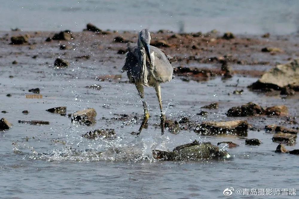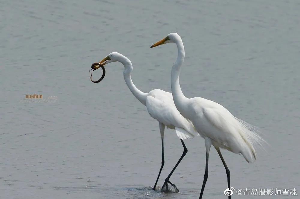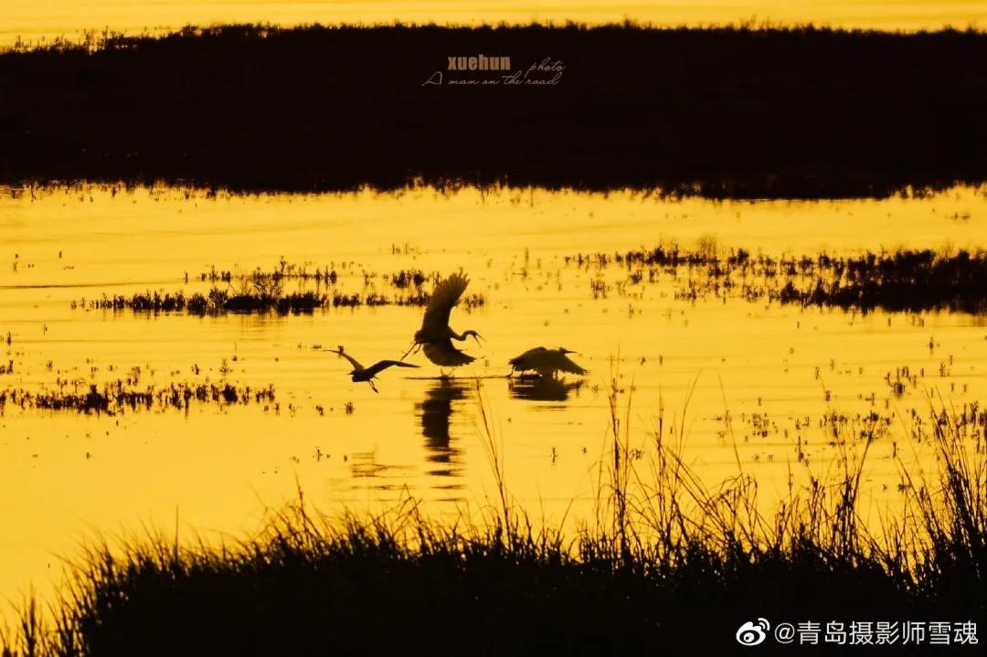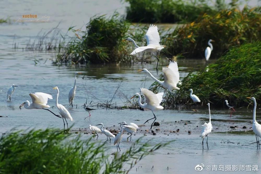 河流泄洪引来成群的鹭鸟在浅滩捕鱼嬉戏