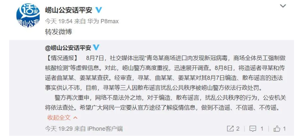 【情况通报】8月7日,社交媒体出现“青岛某商场进口肉发现新冠病毒,商场全体员工强制做核酸检测”等虚假信息。对此,崂山警方高度重视,迅速展开调查。8月8日,将造谣者寻某和传谣者曲某某、姜某某查获。经审查,寻某、曲某某、姜某某对其8月7日编造、散布谣言的违法事实供认不讳,目前,寻某等三人因散布谣言扰乱公共秩序被崂山警方依法行政处罚。