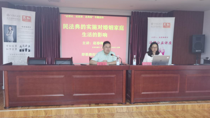 北京市盈科(青岛)律师事务所合伙人律师赵春梅以《民法典的实施对婚姻家庭生活的影响》为题,从民法典全貌、总则编解读、民法典的贯彻实施三个方面进行解读。在简要介绍民法典总则编概况、总则编与民法总则、民法通则的关系以及总则编的修订和要点内容等问题的基础上,在涉及物权、婚姻、继承等方面,深入浅出地阐释了民法典的中国特色、实践特色和时代特色。通过文字、图片、视频等灵活生动的方式,对个人信息保护、离婚冷静期、夫妻共同债务等社会热点问题进行了解读。通过宣讲,让大家对民法典的框架、基本内容、立法精神及重要意义等有了一定的了解,受到大家的肯定与好评。