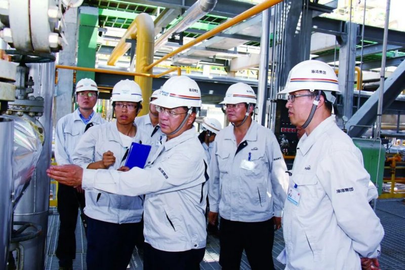 海湾集团董事长、总经理李明(前一)在董家口产业园区海湾化学VCM装置区检查安全生产工作