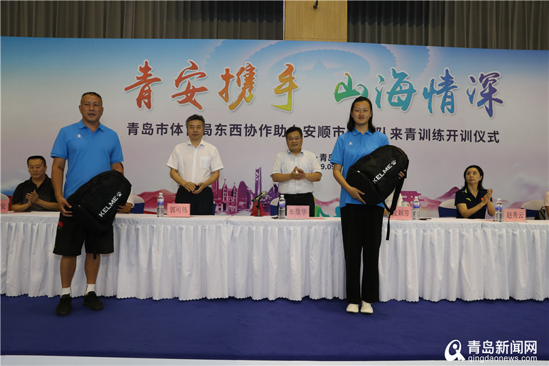 青岛新闻网9月10日讯 (记者 刘文超)9月9日上午,“青安携手 山海情深”青岛市体育局东西协作助力安顺市运动队来青训练开训仪式在青岛市体育运动学校举行。开训仪式上,青岛市体育局党组书记、局长,市体育总会主席车景华,青岛市扶贫协作办一级调研员郭可伟向安顺市体育局教练员、运动员代表赠送训练装备,拉开了安顺市运动队本次来青训练的序幕。