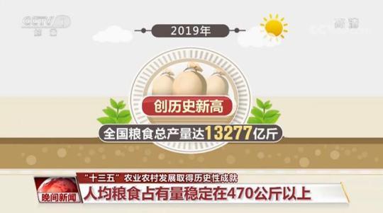 “十三五”期间,我国粮食生产交出沉甸甸的成绩单。2019年,全国粮食总产量达13277亿斤,创历史新高;人均粮食占有量稳定在470公斤以上,远高于国际公认的400公斤粮食安全线。