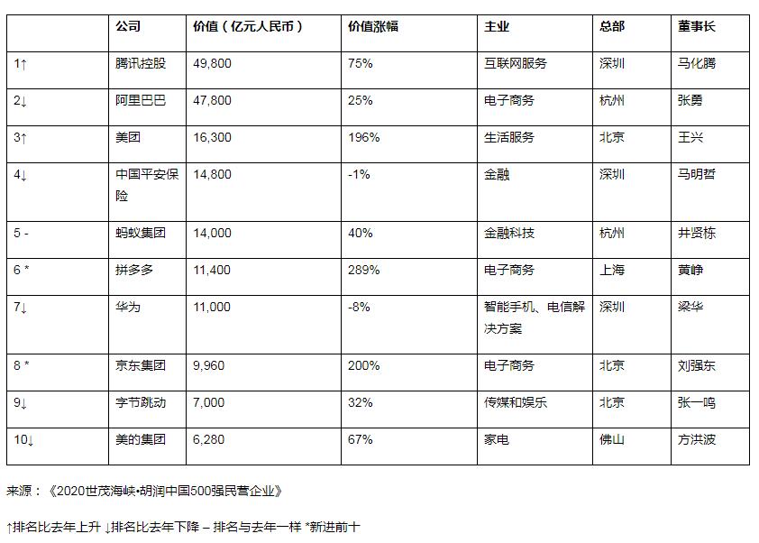 这是胡润研究院第二次发布中国500强民营企业榜单。这里的“中国民营企业”是指总部在中国大陆的非公有制企业。上市公司市值按照2020年10月15日的收盘价计算,非上市公司估值参考同行业上市公司进行估算。