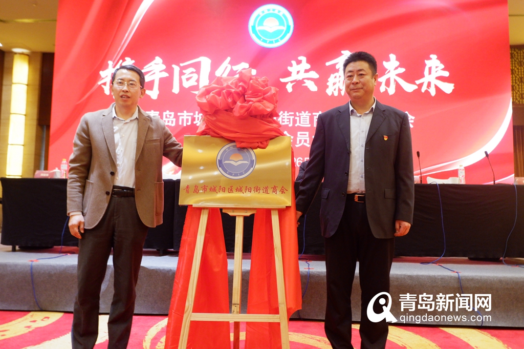 城阳区人大副主任、区工商联主席焉峰和城阳街道党工委副书记王泽旭共同为青岛市城阳区城阳街道商会揭牌。