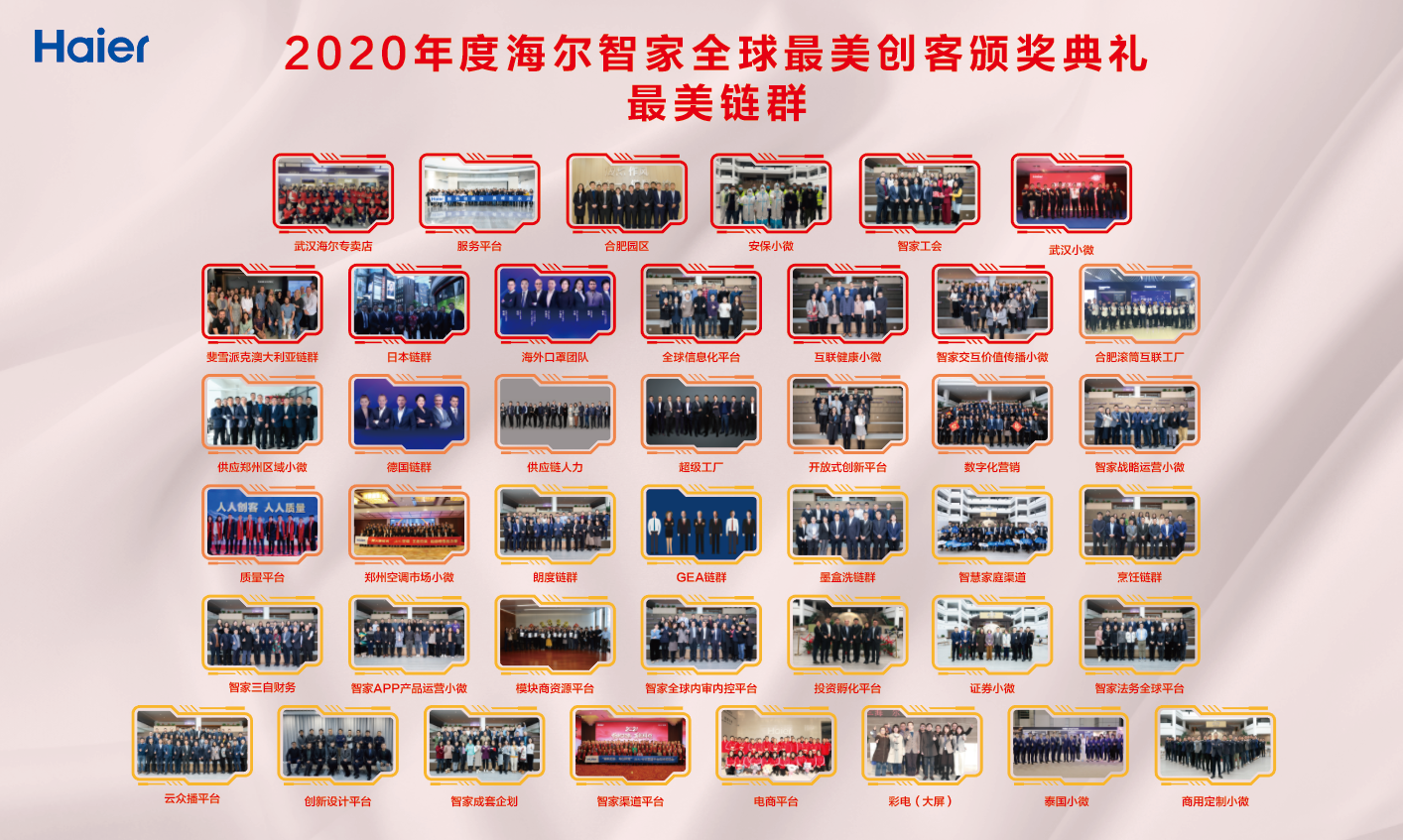 也就是说,这次表彰的对象是在链群合约机制驱动下,全节点、全链群、全生态的并联协同,实现了引爆引领的链群与创客,再次展示出了海尔智家始终坚持“人的价值第一”的理念。据悉,在经过层层选拔后,共有来自全球各地的100名最美创客,以及防控防疫、复工复产、引爆引领三大链群入选。