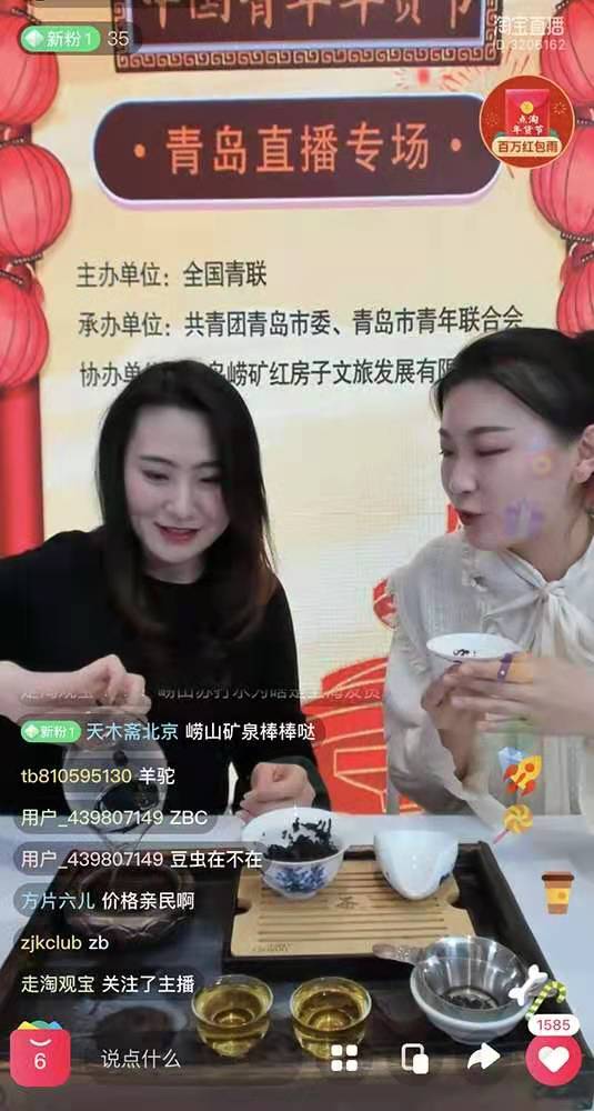 直播期间,主播与三位嘉宾就青联委员助力乡村振兴,参与公益事业进行了互动交流,现场为大家推介了六款具有青岛特色的优质饮品,并且在直播间举行了抽奖互动,整个直播间气氛热烈、互动积极,销售成绩喜人,直播吸引了大量观众,超过90%的新增用户进行下单购买。活动当天,“中国青年年货节”山东主题省日也正式开播,主播与三位青联委员也在直播间积极推介,邀请直播间观众同步关注主题省日的直播活动。