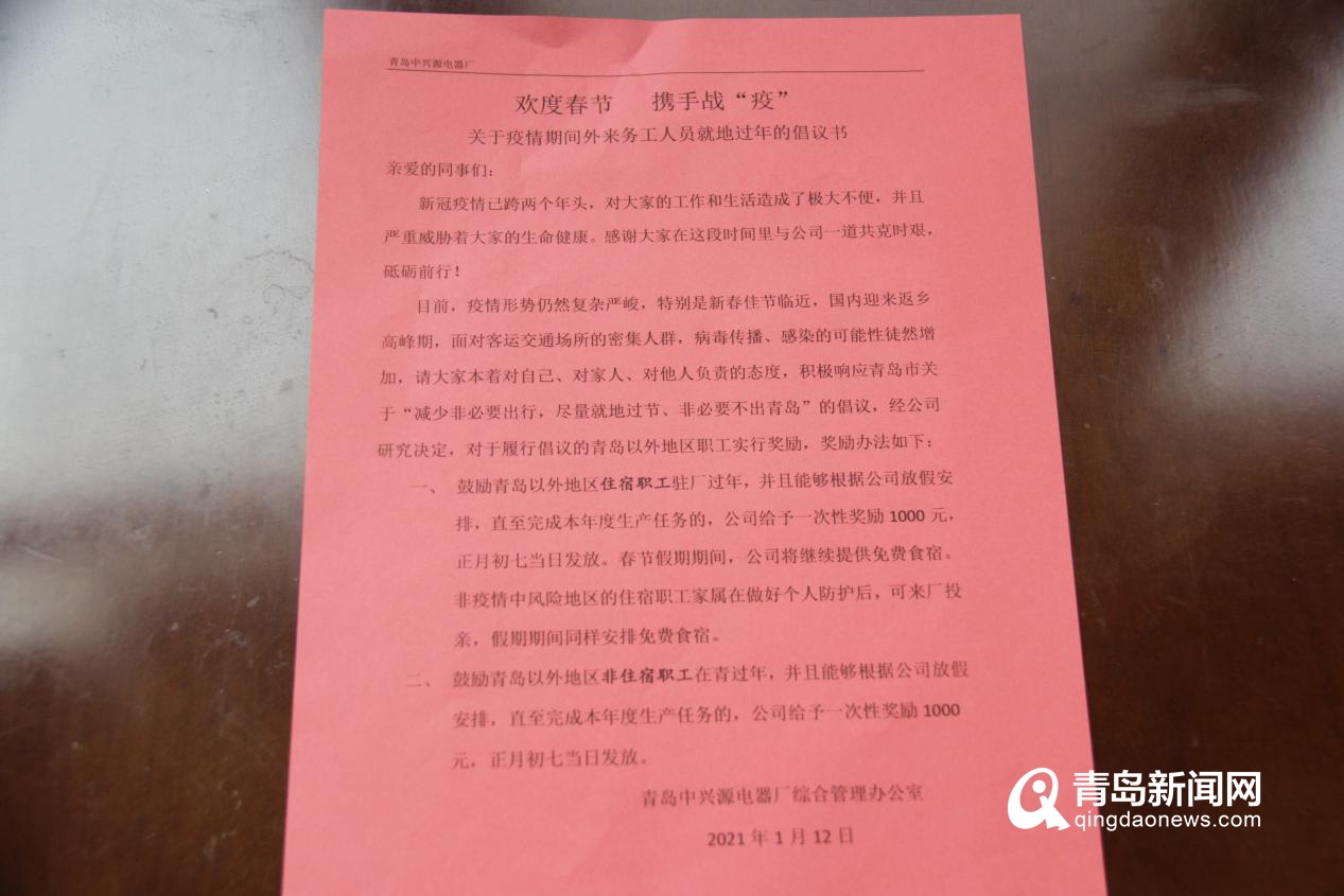青岛新闻网1月29日讯(通讯员 华成新)“我老家在河南,临近春节,无论后期疫情怎么发展变化,我决定留下来过年啦。”1月26日,在街道工作人员入企走访中,辖区企业青岛中兴源电器科技有限公司员工张特立这样说。