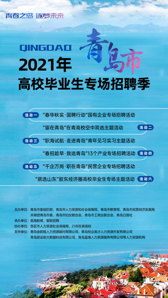 青岛新闻网2月24日讯 2021年2月23日,“青春之岛·逐梦未来”2021年青岛市高校毕业生专场招聘季活动在全球253.5万人共同在线见证下,正式启动。接下来的98天,招聘季将根据海内外高校毕业生、在校生的不同求职特点,通过线上线下招聘、实习见习对接、企业走访观摩、政策宣讲解读、职业规划指导等形式、陆续开展“春华秋实·国聘行动”国有企业专场招聘活动、“留在青岛”在青高校空中双选活动、“职海试航·走进青岛”青年见习实习活动、“春招趁早·我选青岛”13个产业专场招聘活动、“千企万岗·职在青岛”民营企业专场招聘活动、“就选山东”胶东经济圈高校毕业生招聘六大主题活动。