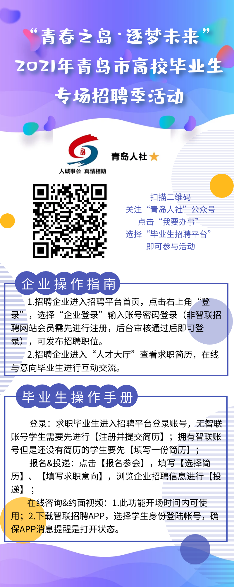 有意向参加招聘活动的用人单位和高校毕业生可扫描下方二维码关注“青岛人社”微信公众号,进入青岛市高校毕业生网络招聘平台参加招聘会。