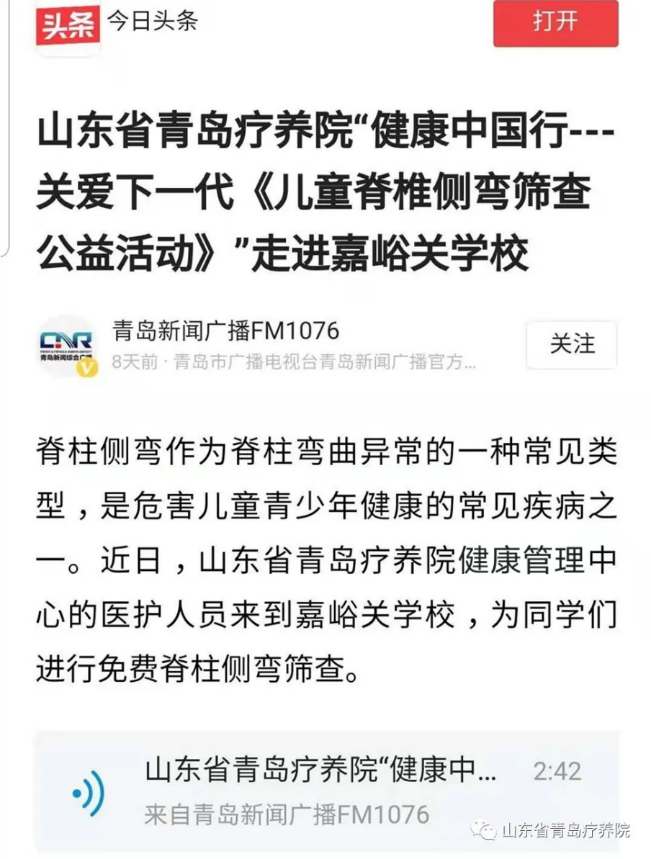 关爱学生成长,践行医者仁心。除了下乡义诊,健康管理中心还致力于关爱学生成长,每年多次组织医疗小队前往嘉峪关学校为学生进行视力检查,脊柱检查等儿童时期常见疾病筛查。为积极引导公众科学防控近视,关爱儿童眼健康,中心组织眼科专家自带医疗器械到嘉峪关学校开展“爱眼护眼,健康成长”视力筛查活动,为每位筛查学生建立视力档案表。对发现异常的儿童做好标记,告知老师家长,做好健康宣教,及时干预,保护儿童眼健康。脊柱侧弯好发于青少年,严重者会影响儿童发育,是危害青少年和儿童的常见疾病,关键在于早发现,早治疗。健康管理中心联合康复保健中心专家多次入校园,为青少年儿童进行脊柱筛查。脊柱筛查活动让学校和家庭提高了儿童脊柱健康问题的关注,让脊柱侧弯的患儿得到了早期发现,早期治疗,得到了青岛市教育局和广大患儿家长的认可和感谢。一系列的入校园活动关爱了学生成长,践行了医者仁心。