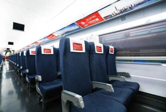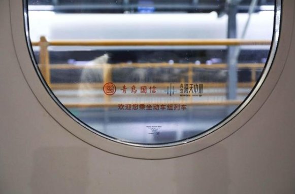 “青岛国信海天中心号”高铁上处处充满海天中心元素。在车身上,醒目的“青岛国信集团海天中心”标识与具有“国家形象意义”的高铁形象相得益彰。在车厢内,印有海天中心图片的品牌天幕抬头可见,头片、桌贴上的海天中心形象入座即见,营造出属于青岛国信海天中心的专属场景。语音、视频、图片等全媒体形象展示为消费者打造了全方位、立体化的沉浸式体验氛围。