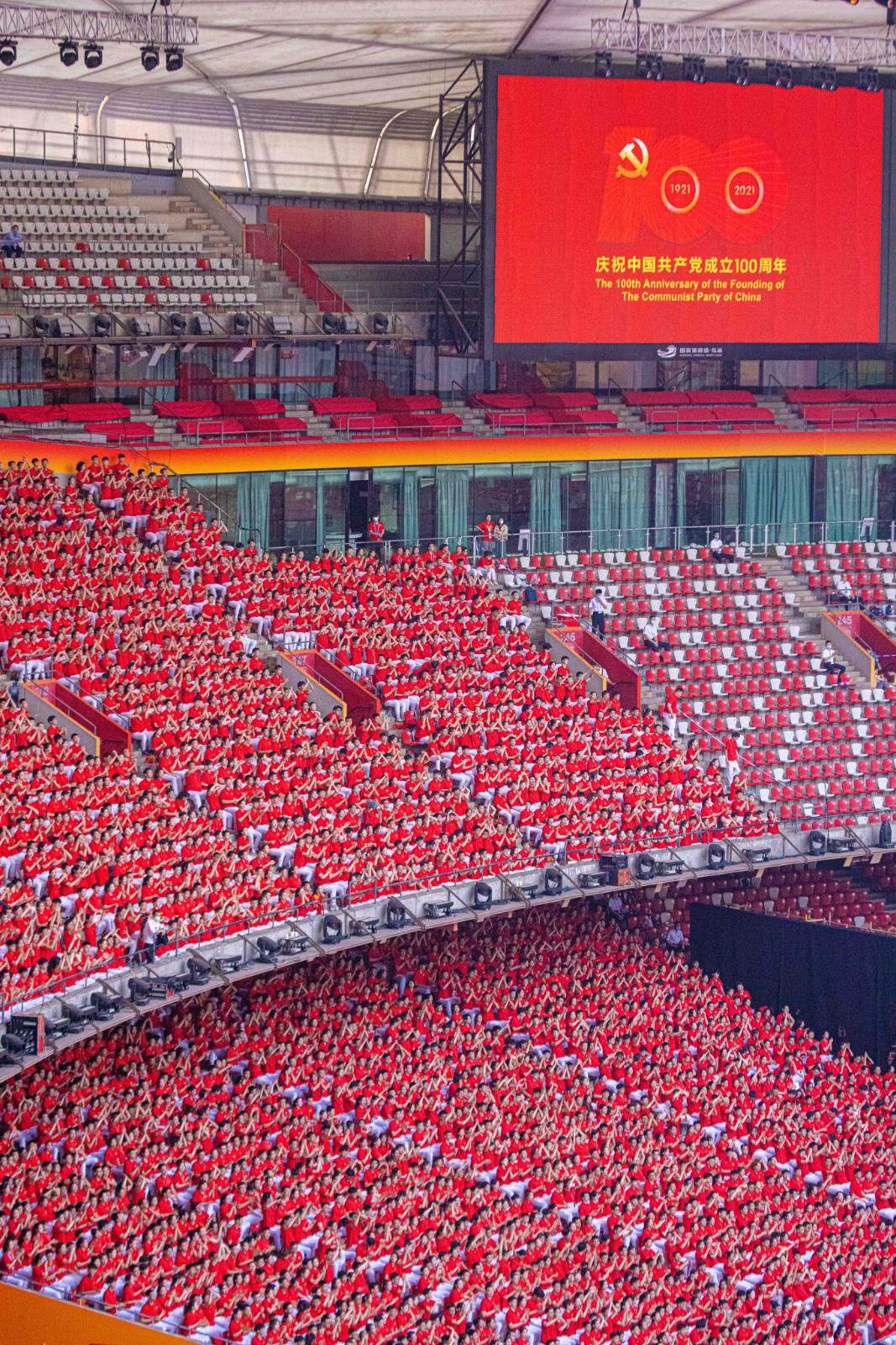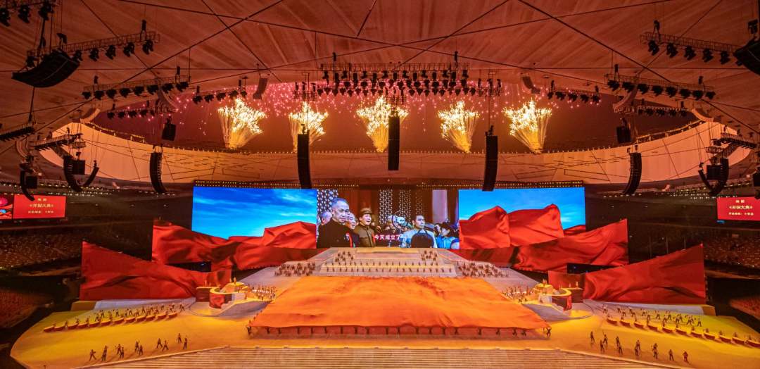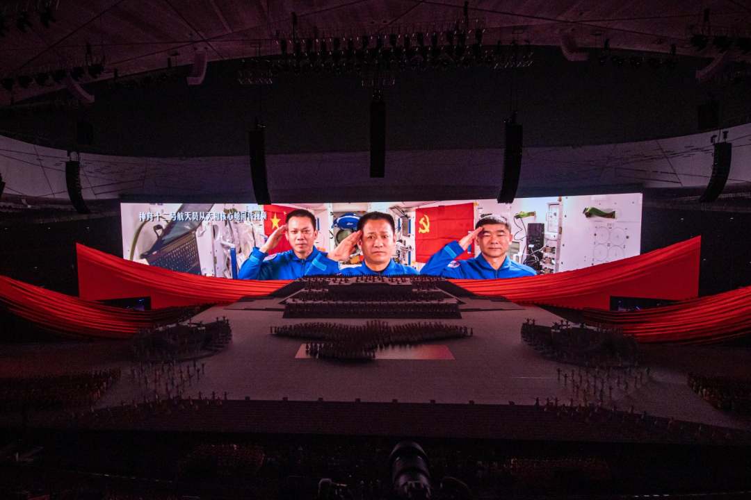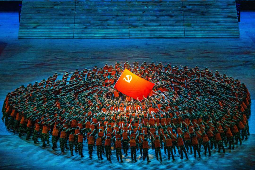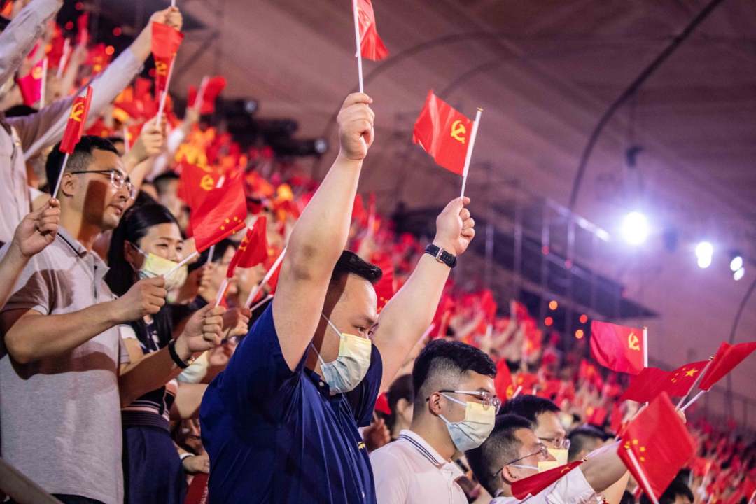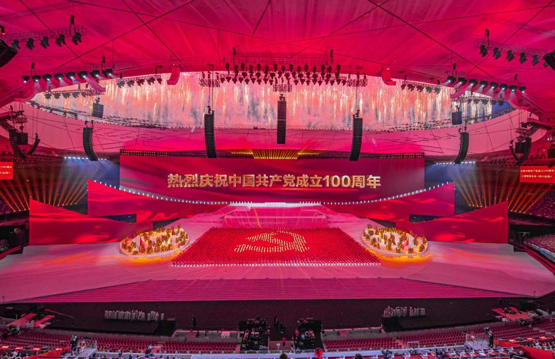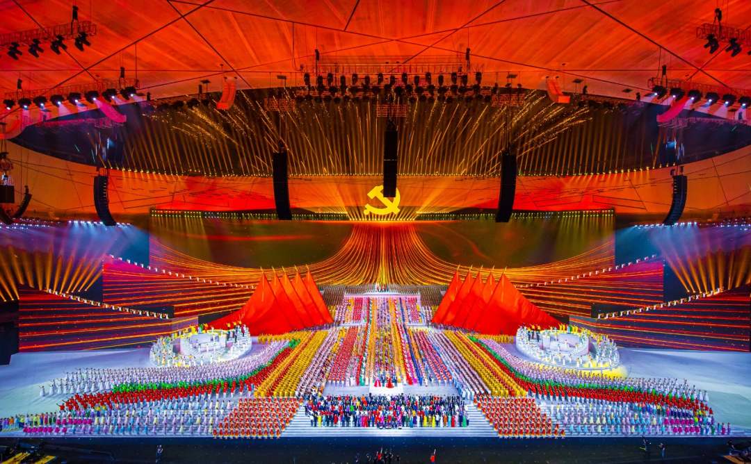 庆祝中国共产党成立100周年文艺演出《伟大征程》在国家体育场盛大举行。让我们共同回顾中国共产党成立100年来波澜壮阔的光辉历程,共同祝福伟大的党带领中国人民迈进新征程、奋进新时代。图为建党百年文艺演出现场。(人民日报记者 张武军 摄)