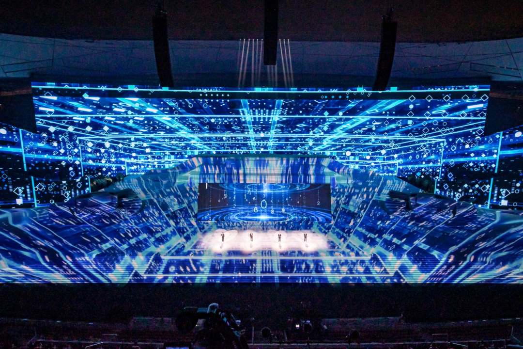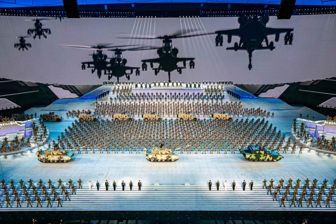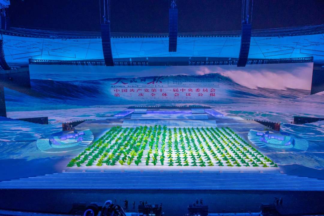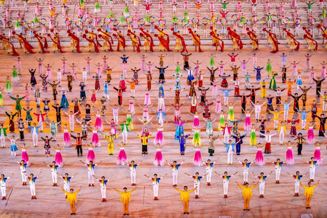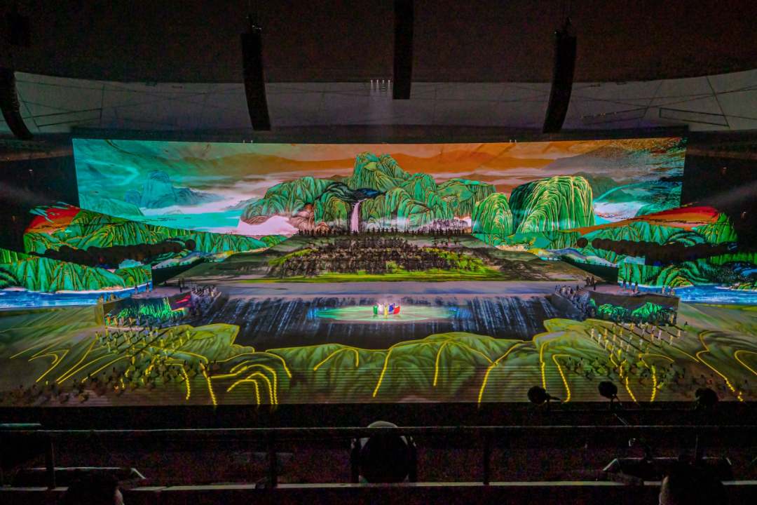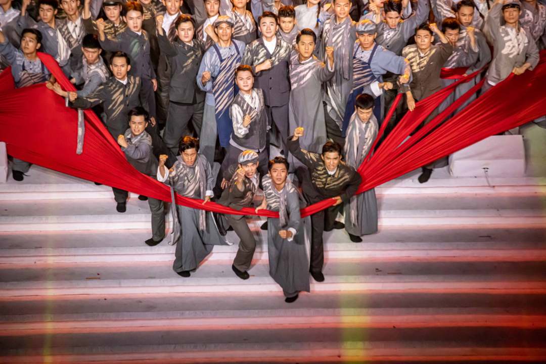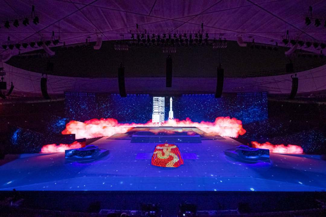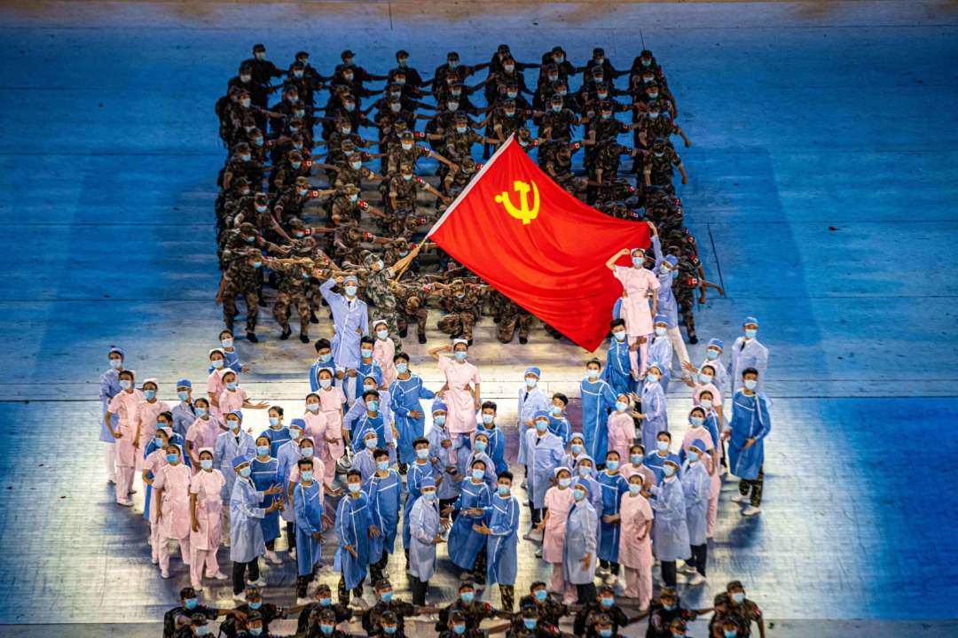 庆祝中国共产党成立100周年文艺演出《伟大征程》在国家体育场盛大举行。让我们共同回顾中国共产党成立100年来波澜壮阔的光辉历程,共同祝福伟大的党带领中国人民迈进新征程、奋进新时代。图为建党百年文艺演出现场。(人民日报记者 张武军 摄)