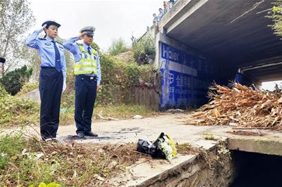5日,早报记者赶到事发地点,桥下的水渠旁还残存着一些血迹,李涌就牺牲在这里。李涌同事和其他赶来缅怀李涌的人,已经在此处放上鲜花和矿泉水。这是一处高速公路下穿的乡村公路涵洞,从地面到高速公路护栏有近4米的高度,下面是水泥硬化的路面,旁边是一处半米宽的水渠。李涌跌落的地方就在水渠和路边之间。