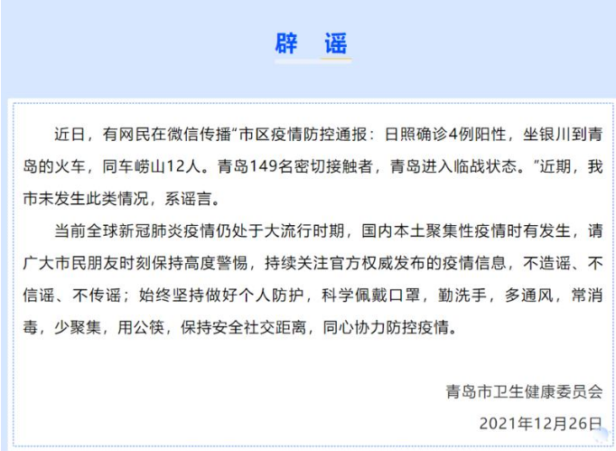 青岛新闻网12月26日讯(记者 李丽涛)近日,有网民在微信传播“市区疫情防控通报:日照确诊4例阳性,坐银川到青岛的火车,同车崂山12人。青岛149名密切接触者,青岛进入临战状态。”青岛市卫生健康委员会对此进行官方回应:我市未发生此类情况,系谣言。