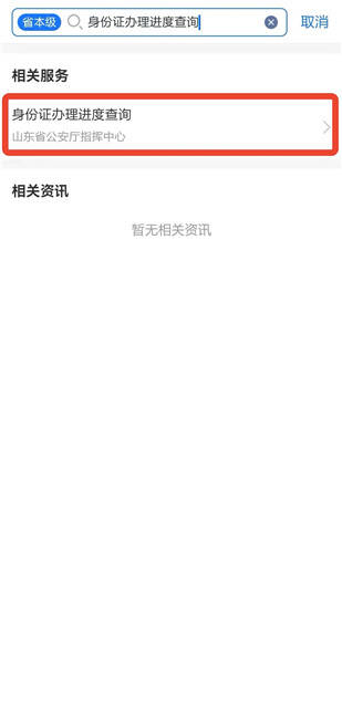 打开“爱山东”APP,首页搜索“身份证办理进度查询”,点击进入(详见图1)。