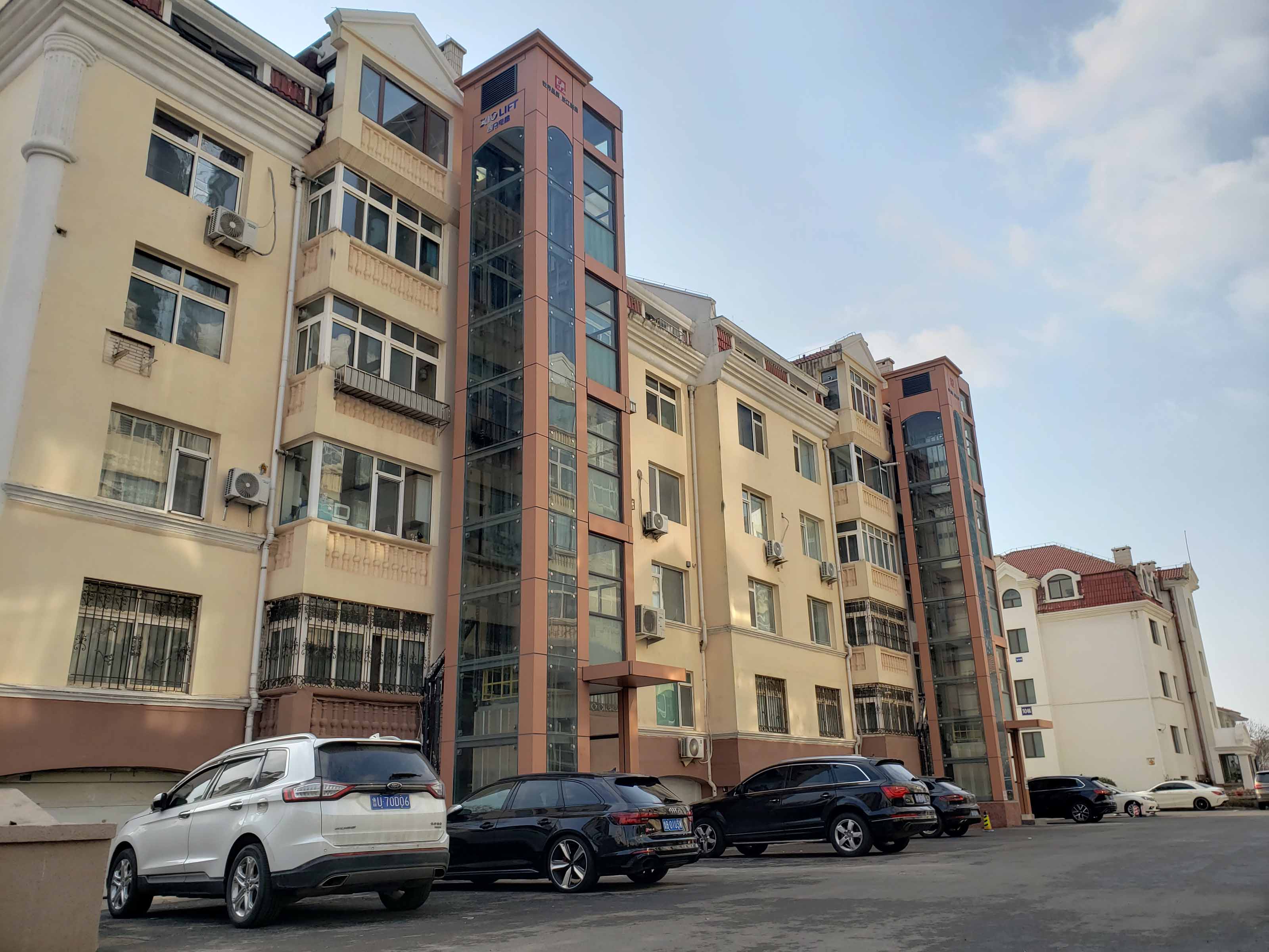 干净的楼院内,车辆停放整齐,5部外挂电梯矗立在单元楼之间,逍遥花园小区整洁又有序。