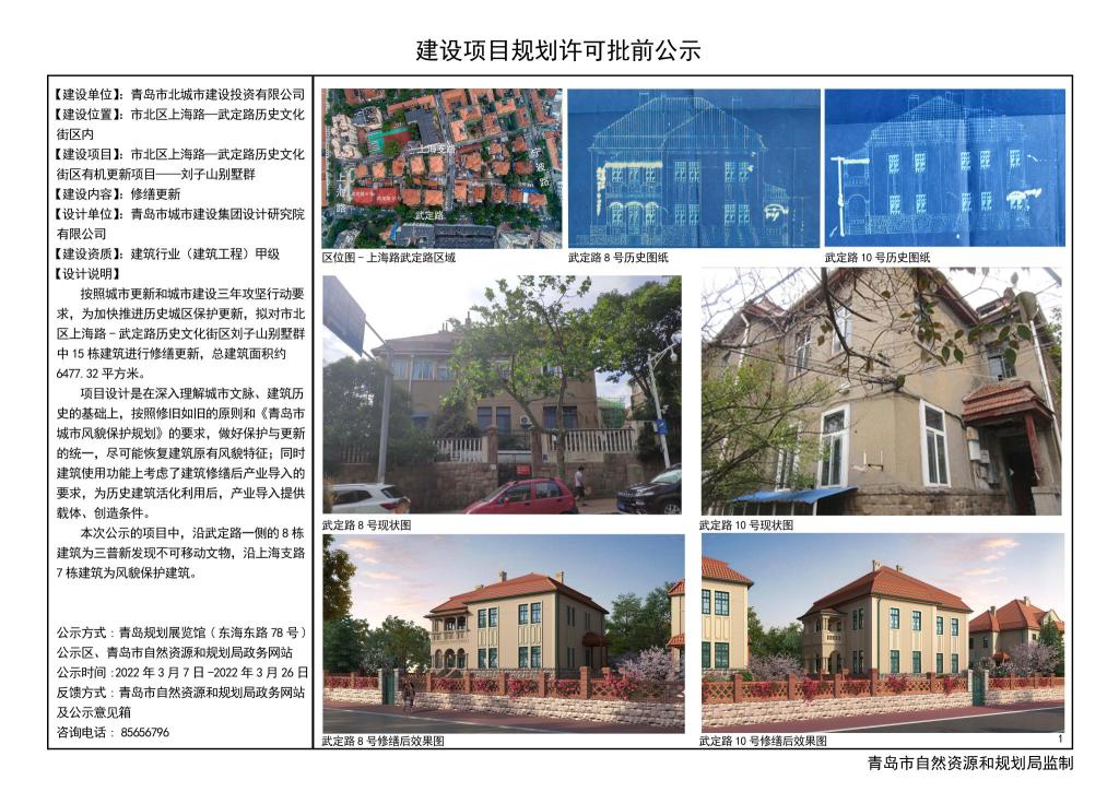 3月7日,记者从青岛市自然资源和规划局获悉,市北区上海路—武定路历史文化街区有机更新项目——刘子山别墅群修缮更新方案批前公示,项目由青岛市北城市建设投资有限公司建设。