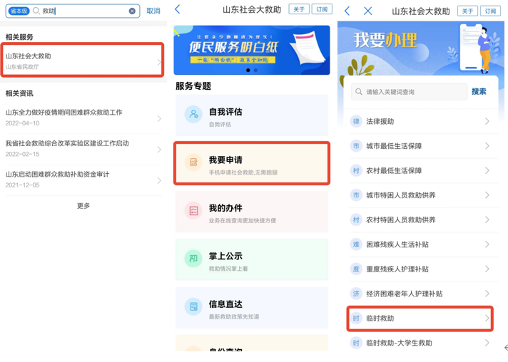 1.打开“爱山东”APP、支付宝小程序或微信小程序,首页搜索“救助”,点击进入“社会大救助”服务。
