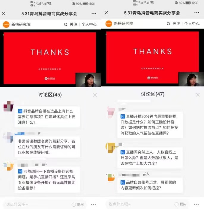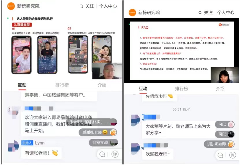 2022年5月31日,主办方青岛市商务局联合青岛新闻网为青岛企业及商家联合奉上“青岛品牌馆抖音电商培训课”,课程兼顾了运营零基础、进阶运营两个阶段的群体。有助抖音策略运营高级总监张艾潮、有助抖音品牌自播运营总监魏媛分别为学员奉上题为“抖音品牌直播这样做”、“抖音达人带货决胜宝典”的线上直播课。