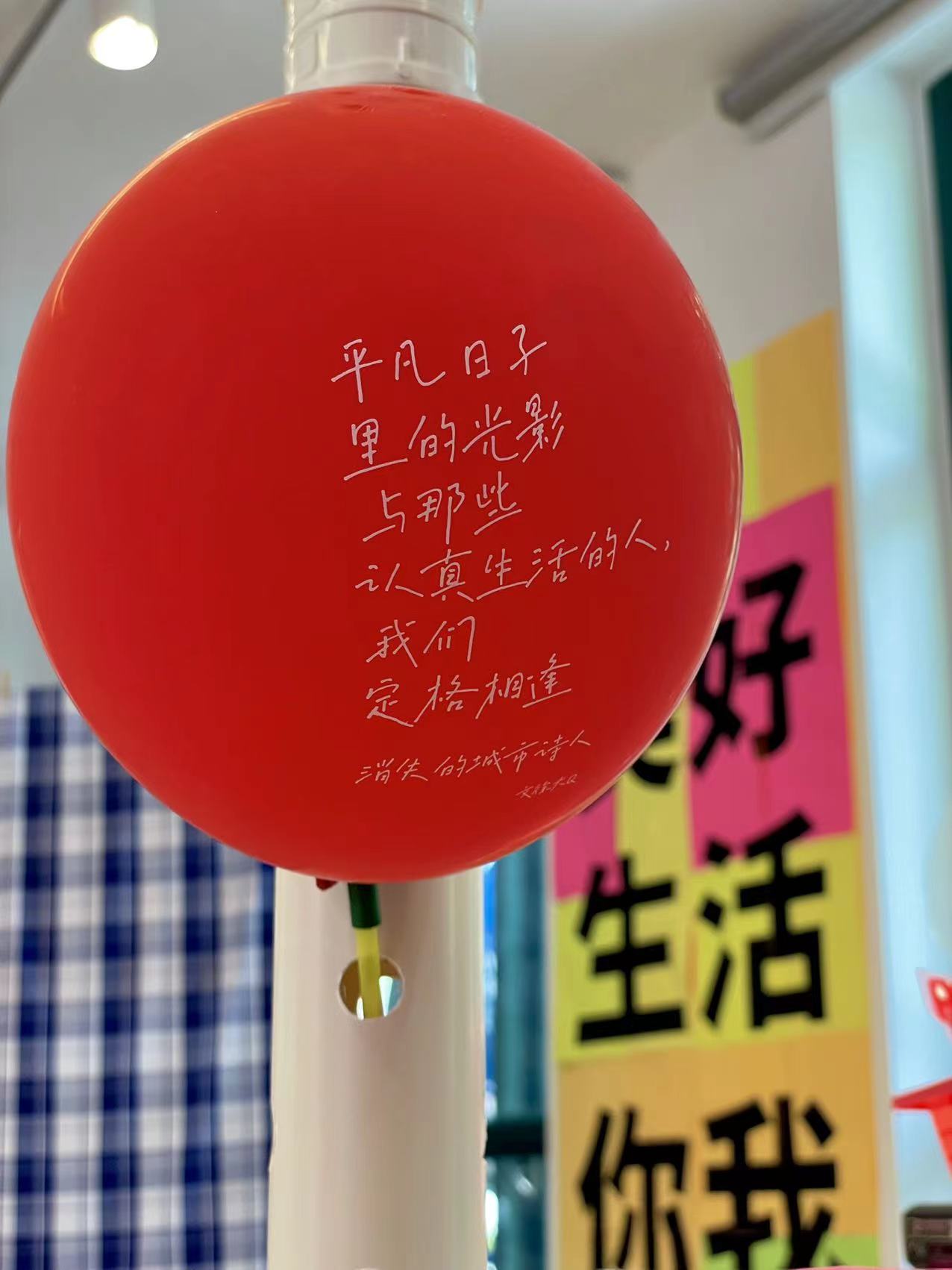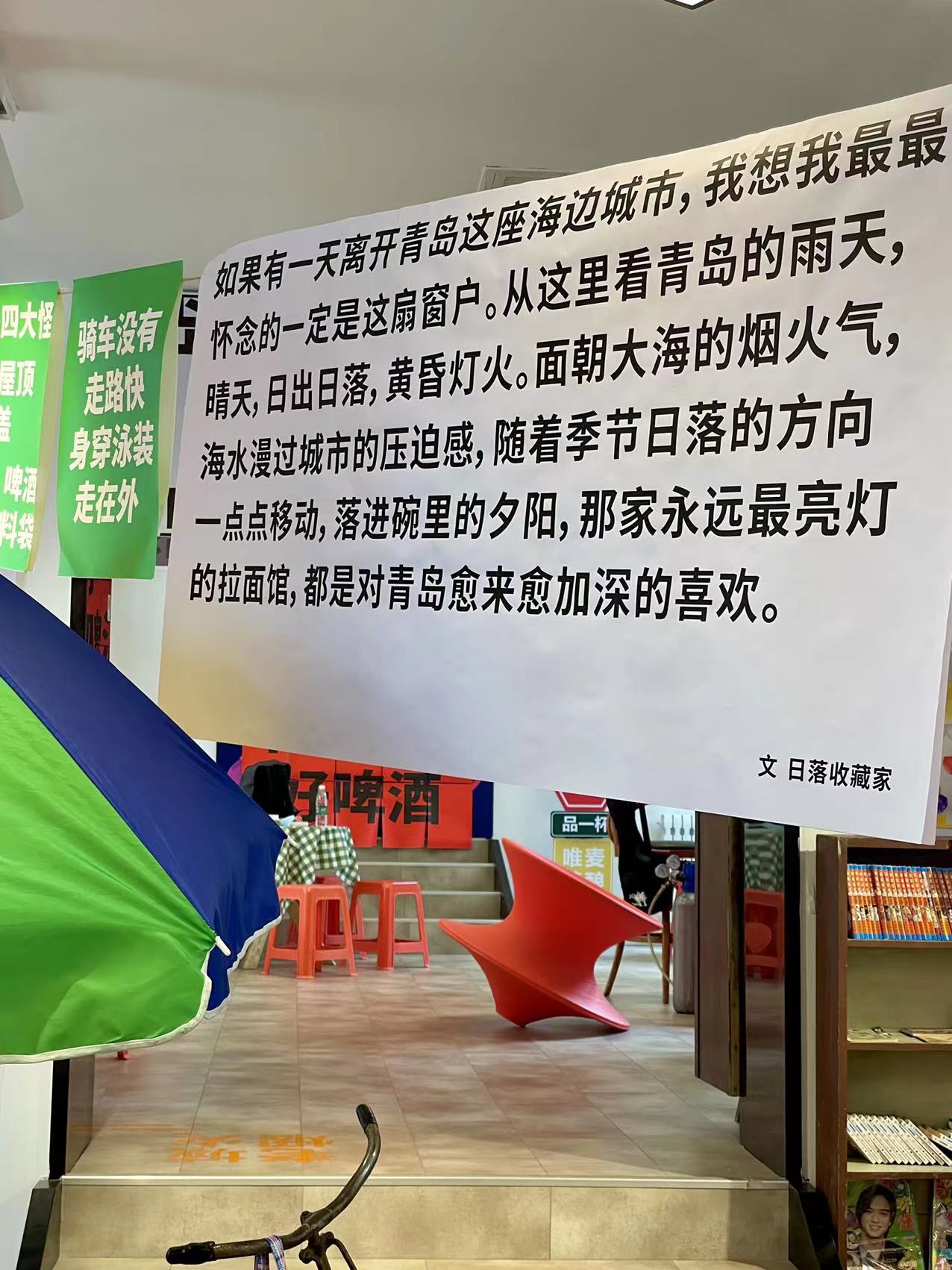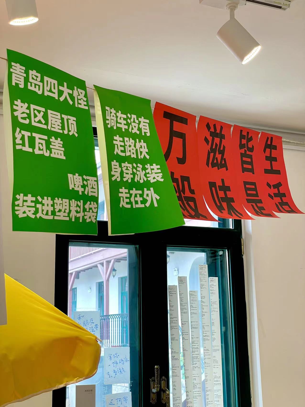 慢闪艺术展中,还有一些原创品牌的加持,用色彩,用布景,为平淡的生活留下想象的空间。带有青岛人文风俗的话语和文字,就像这座城市的诗人,朴实又生动的记录着市井烟火。