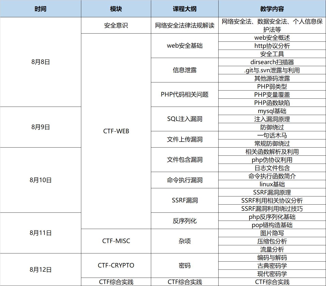 3.竞赛系统讲解阶段(8月12日下午):组织参训学员进行一次与正式比赛相同的CTF综合实践,采用与正式比赛一致的竞赛系统进行模拟使用,帮助大家熟悉竞赛平台和比赛模式。测验赛结束后,将由讲师对模拟测试题目进行复盘讲解。