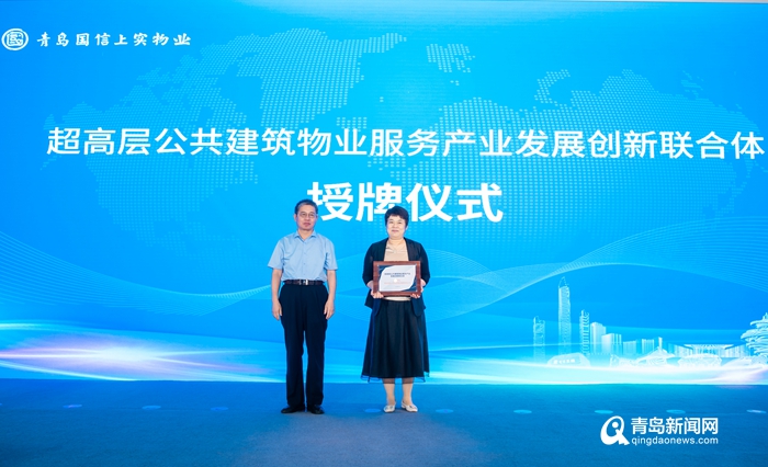 成立大会上,出席会议的领导共同为山东省超高层物业发展创新联合体揭牌,周善东为青岛国信上实城市物业发展有限公司颁发山东省超高层物业发展创新联合体主任单位证书。