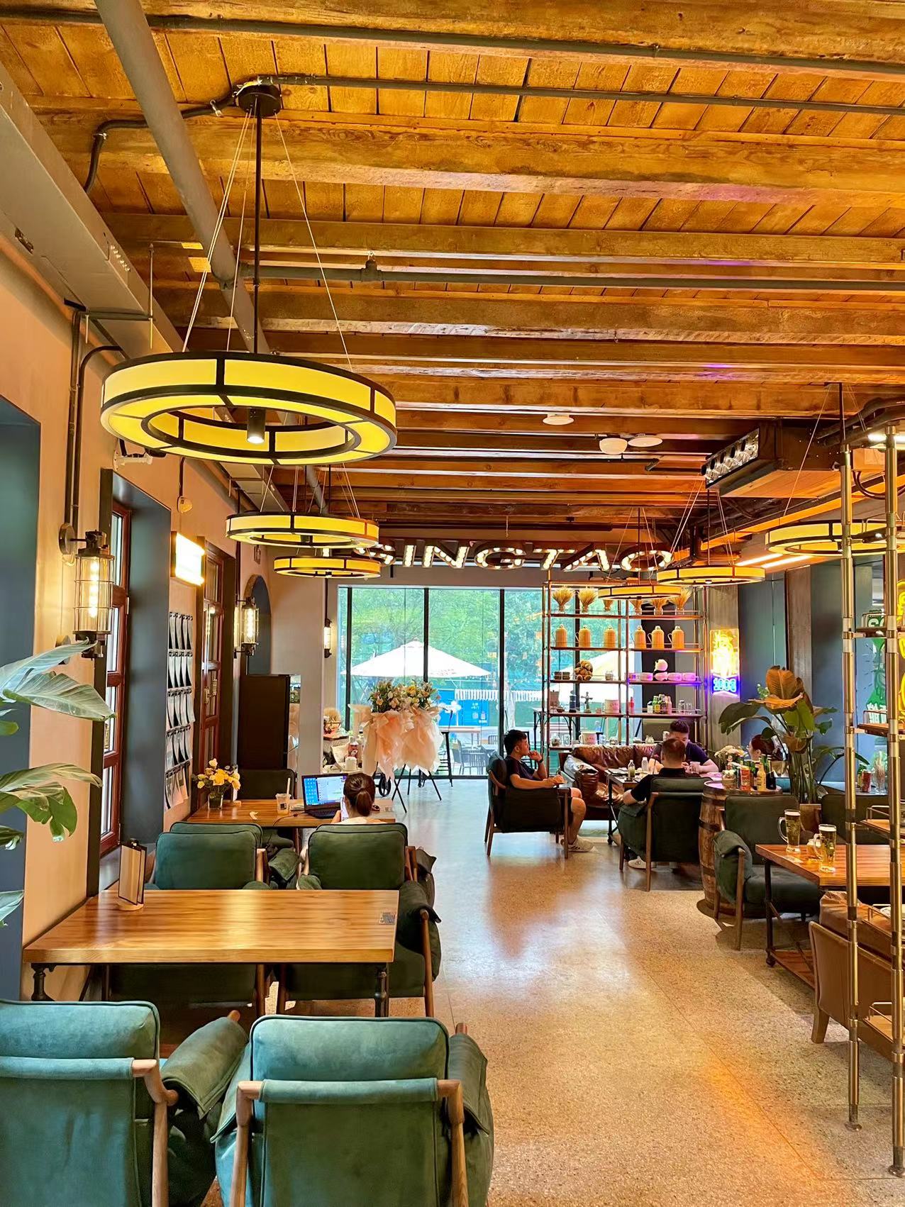 1903青岛酒馆共两层,一层有饮品区、就餐区和膨胀酵主面包区,二层有茶室、酒吧、图书馆、包间和民宿。