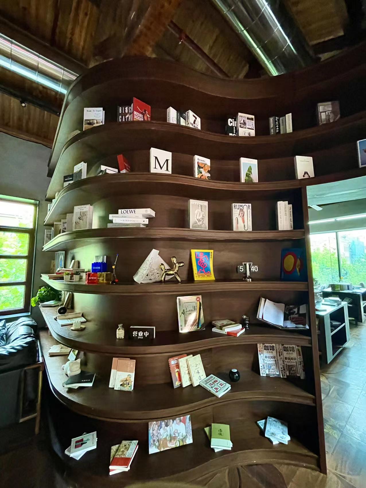 中间的小院落也很有特色,一辆青岛酒馆的巴士停在中间,晚上来点音乐和灯光,应该很有氛围。二层的图书馆很安静,除了有很多关于啤酒文化的书籍,还有一些文创产品,都可以看看。