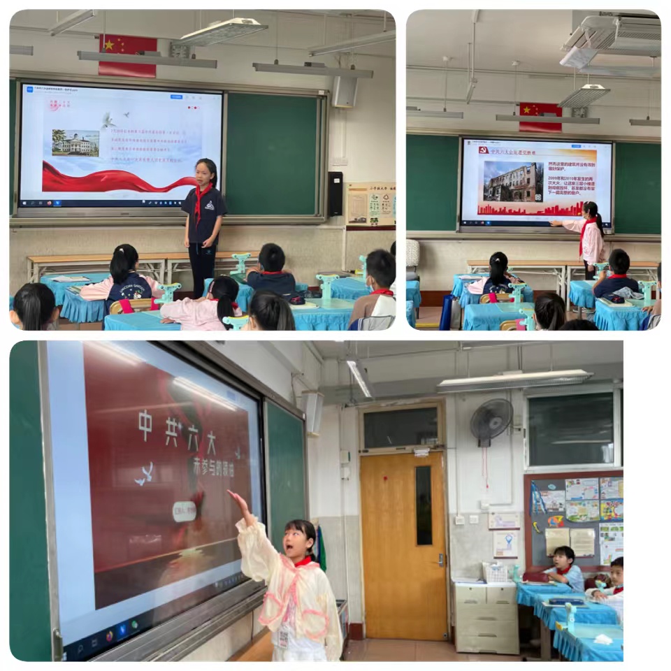 学生们根据学校的统一安排,在老师的组织下,9月19日的主题班会中,学生们分享了自己的研究性学习成果,通过学习,孩子们了解了中国共产党发展的历程、人物以及精神内涵。在研究性学习的过程中,孩子们感受到中国共产党发展的艰苦历程,从而更加珍惜革命先辈浴血奋战为我们创造的美好生活。