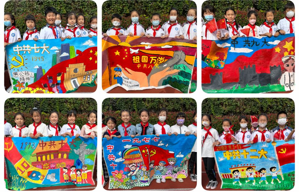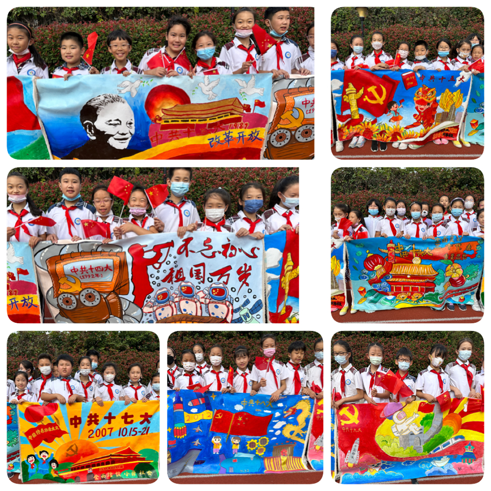 在9月26日——9月29日,各班学生在班主任与美术老师的指导下,围绕自己班级提炼的会议精神进行了绘画创作。孩子们通过色彩的表达、文字的描述将自己的感悟淋漓尽致的表达在画布上,通过一幅幅色彩鲜明、主题突出的绘画作品,看到了孩子们在集体创作中升华的民族自豪感和荣誉感。