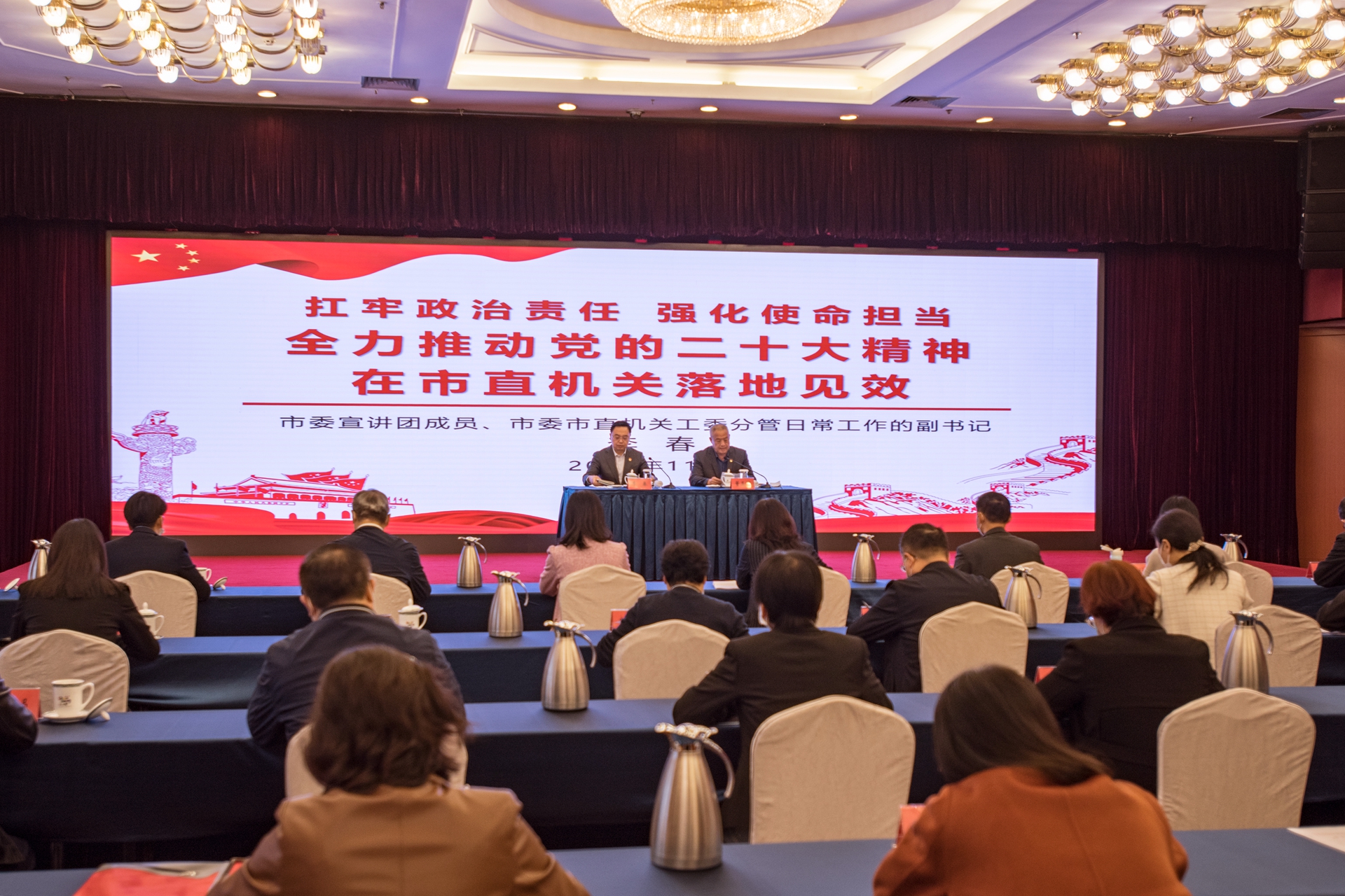 青岛新闻网11月21日讯 11月17日上午,市直机关学习贯彻党的二十大精神宣讲报告会在市级机关会议中心一楼会议厅举行。市委宣讲团成员、市委市直机关工委分管日常工作的副书记李春同志作报告。报告会同时对市直机关广泛深入开展党的二十大精神宣讲工作进行了再动员、再部署。市直机关党组织专职副书记代表,工委机关党员干部代表等50人参加报告会。