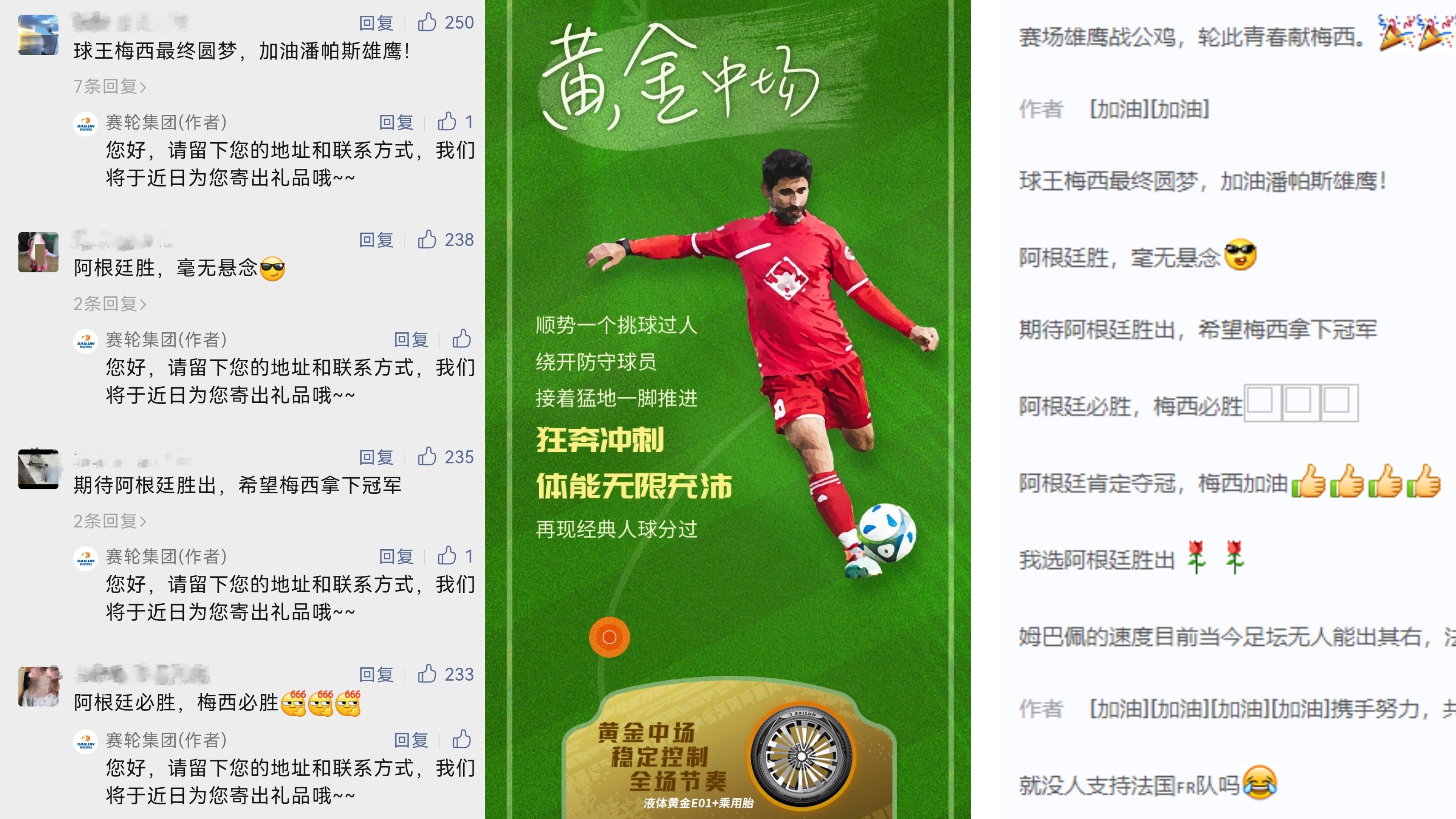 没想到赛轮在数字营销领域也在深度发力,通过多渠道、多元化的品牌活动,特别是在体育、汽车赛事等领域。之前就赞助过西甲足球俱乐部,而今年恰逢世界杯,竞猜是逃不掉的主题,这次推文借势世界杯竞猜冠军并融入十年磨一剑的赛轮新品液体黄金轮胎,为品牌建设赋能,带动用户参与互动,评论量直线UP,使得单篇文章评论点赞数脱颖而出,一举获得最具人气奖。