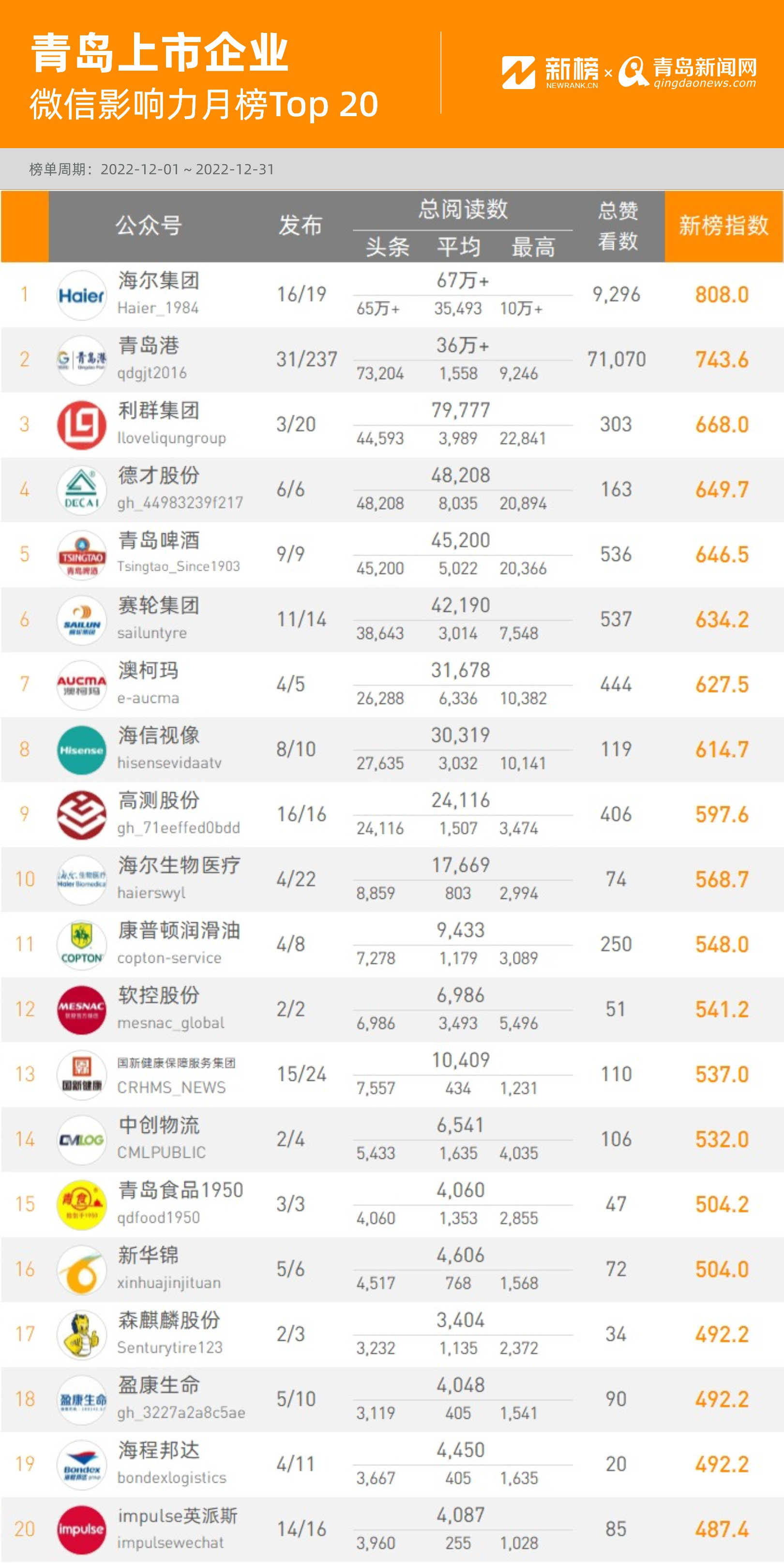 近年来,青岛市上市公司数量整体保持较快增长。1月12日,由青岛新闻网和新榜联手打造的“青岛上市企业微信影响力排行榜”,通过对青岛上市企业微信公众号的日常监测,对所有账号在统计周期内所发布内容的发文总数、总阅读数、头条阅读数、平均阅读数及总点赞数等海量数据进行分析,青岛上市企业微信影响力月度排行榜前20强的神秘面纱即刻揭晓!