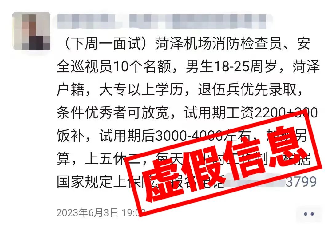近期,山东省机场管理集团菏泽机场有限公司(以下简称“菏泽机场”)发现不法分子以菏泽机场的名义进行虚假招聘,通过微信、网站等渠道发布所谓的菏泽机场消防检查员、安全巡视员等岗位的虚假、不实招聘信息,宣称可以与菏泽机场直签劳动合同,向求职者骗取入职费用等等。相关违法行为严重侵犯求职者合法权益,损害菏泽机场形象,造成不良社会影响。为保护各方合法权益,防范欺诈行为,特声明如下: