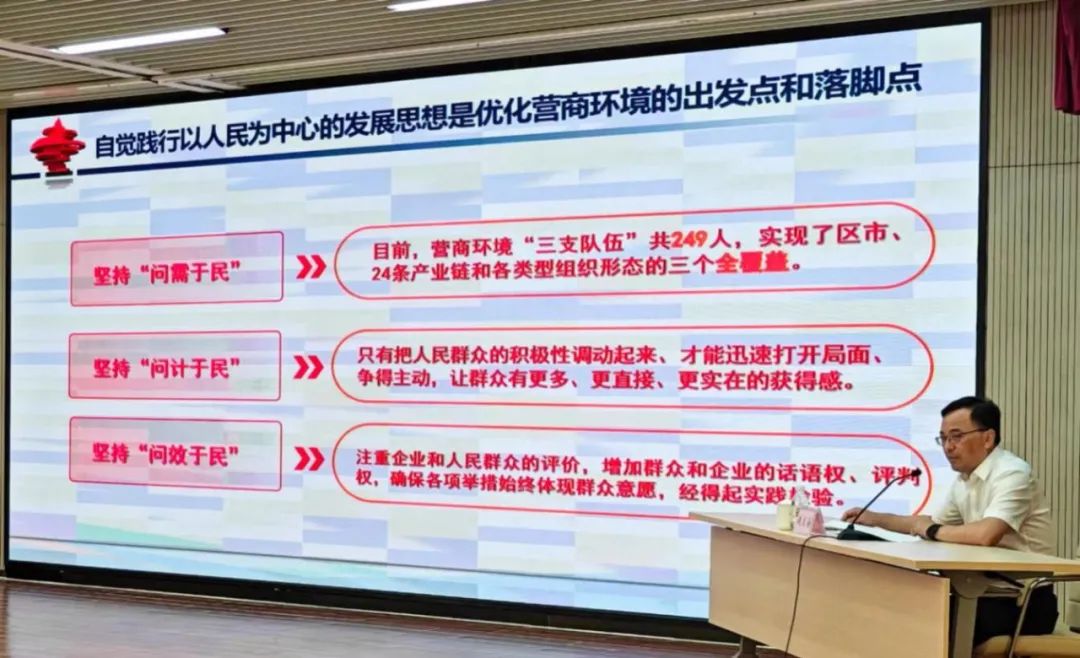 赵发海同志结合学习心得和前期调研情况,重点从三个方面展开详细的阐述,为全局党员、干部深入开展学习贯彻习近平新时代中国特色社会主义思想主题教育提供了具体行动指导。一是在学深悟透习近平总书记关于优化营商环境重要论述上下功夫。坚持党的领导是优化营商环境的根本保证,自觉践行以人民为中心的发展思想是优化营商环境的出发点和落脚点,处理好政府与市场关系是优化营商环境的关键所在,深化改革创新是优化营商环境的源头活水。二是在认清优化营商环境面临的新形势新任务上出实招。要充分认识国内外复杂形势给优化营商环境带来的巨大压力,深入挖掘和激发新时代优化营商环境所蕴藏的无穷潜力,在新征程上立足本职,实现优化营商环境新突破。三是在立足审批服务实践打造一流营商环境上求实效。要坚持以干成事论英雄、以解决实际问题论能力,以高质量发展项目论业绩,把抓工作落实当作全局工作的生命线,锤炼一流作风、锻造一流队伍、铸就一流事业,重点开展好七项行动:党建品牌擦亮行动、作风能力提升行动、营商环境攻坚行动、政务服务增值行动、数字赋能深化行动、意见建议清零行动、自我革新提高行动。