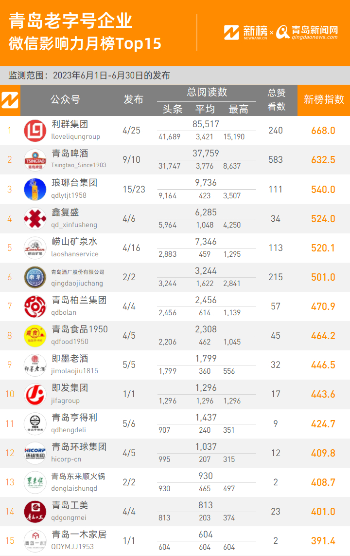 6月份青岛老字号企业微信影响力排行榜TOP15即刻揭晓。本期榜单统计周期是2023年6月1日到2023年6月30日。