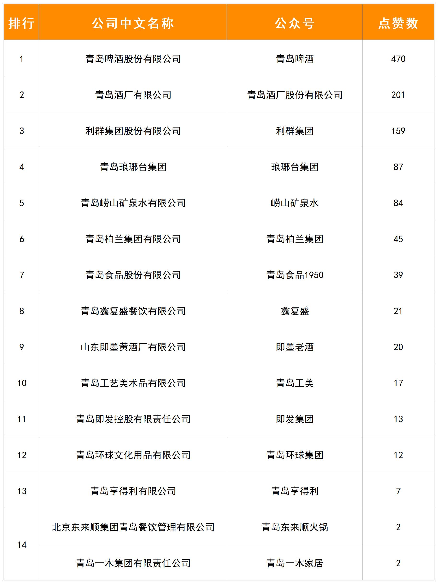 感谢您的关注!本次榜单收录了大部分的青岛老字号企业类微信公众号,如您的账号暂未收录或者账号有出入,可电话咨询:13475323886。