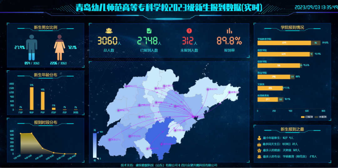 智慧化迎新更直观。运用大数据、云计算,实时更新新生报到数据,生源地、报道人数、男女比例等一目了然。获取信息更方便、更快捷,登录手机综合校情即可远距离实时查看,方便服务师生统筹工作。
