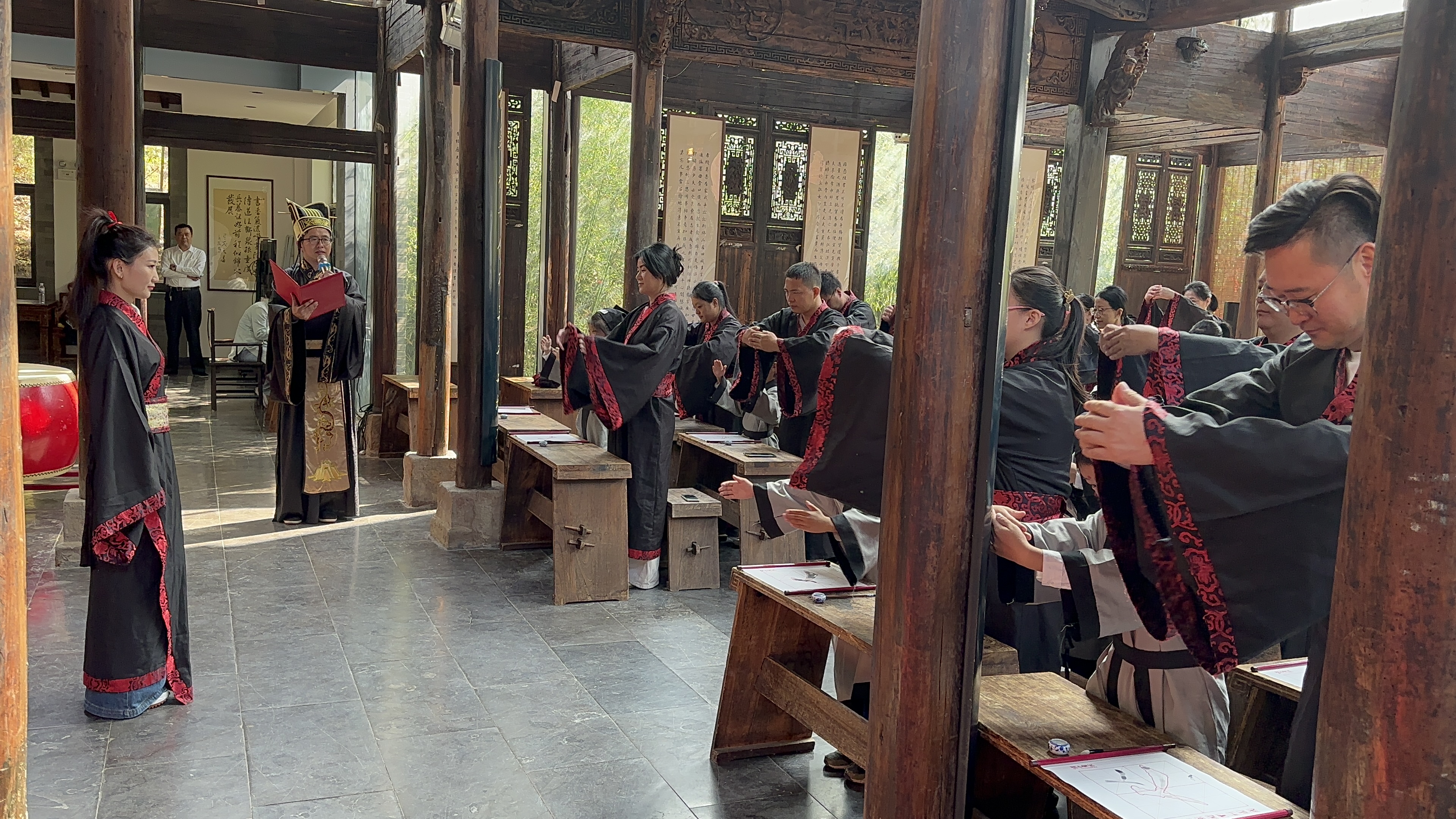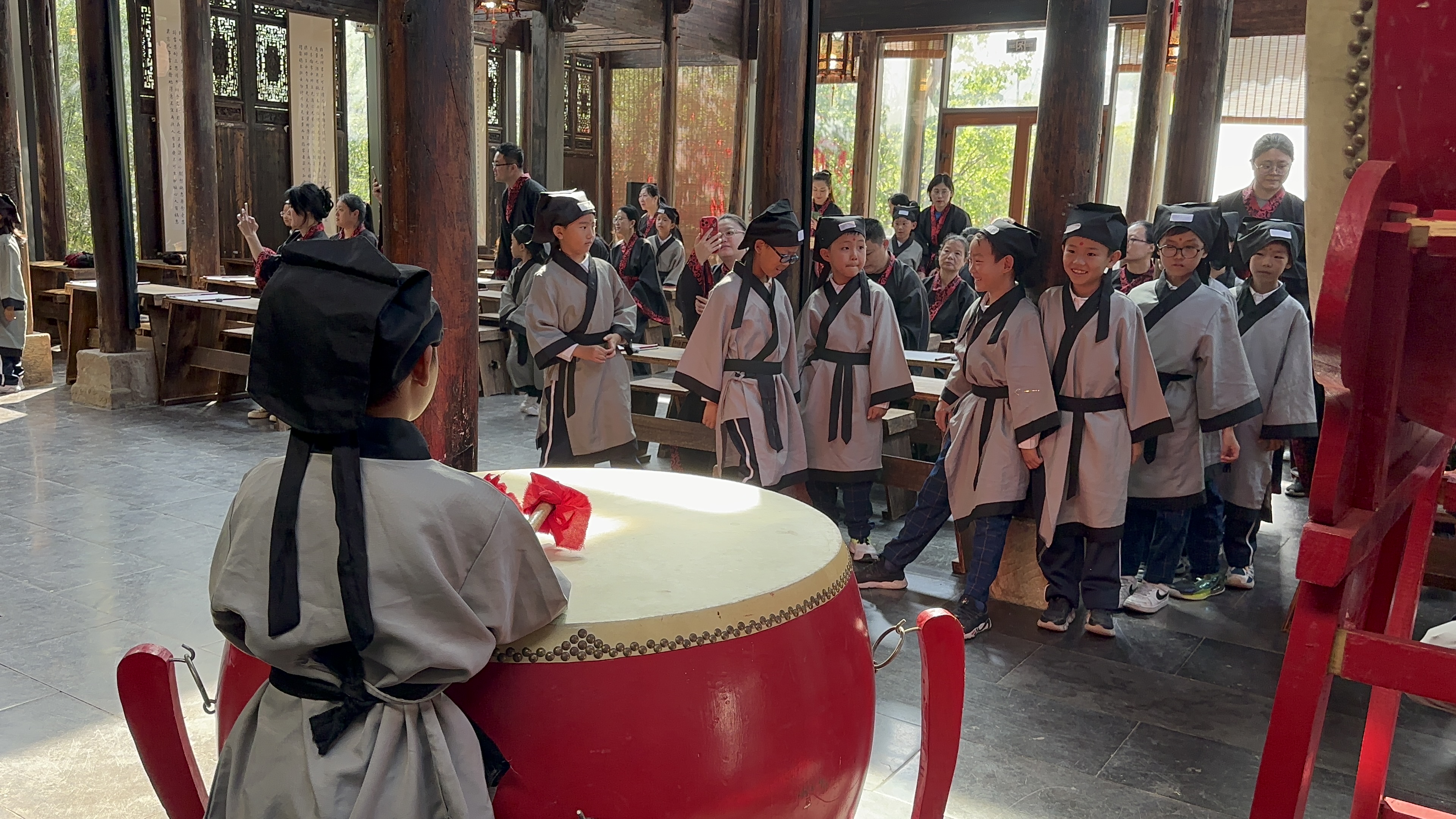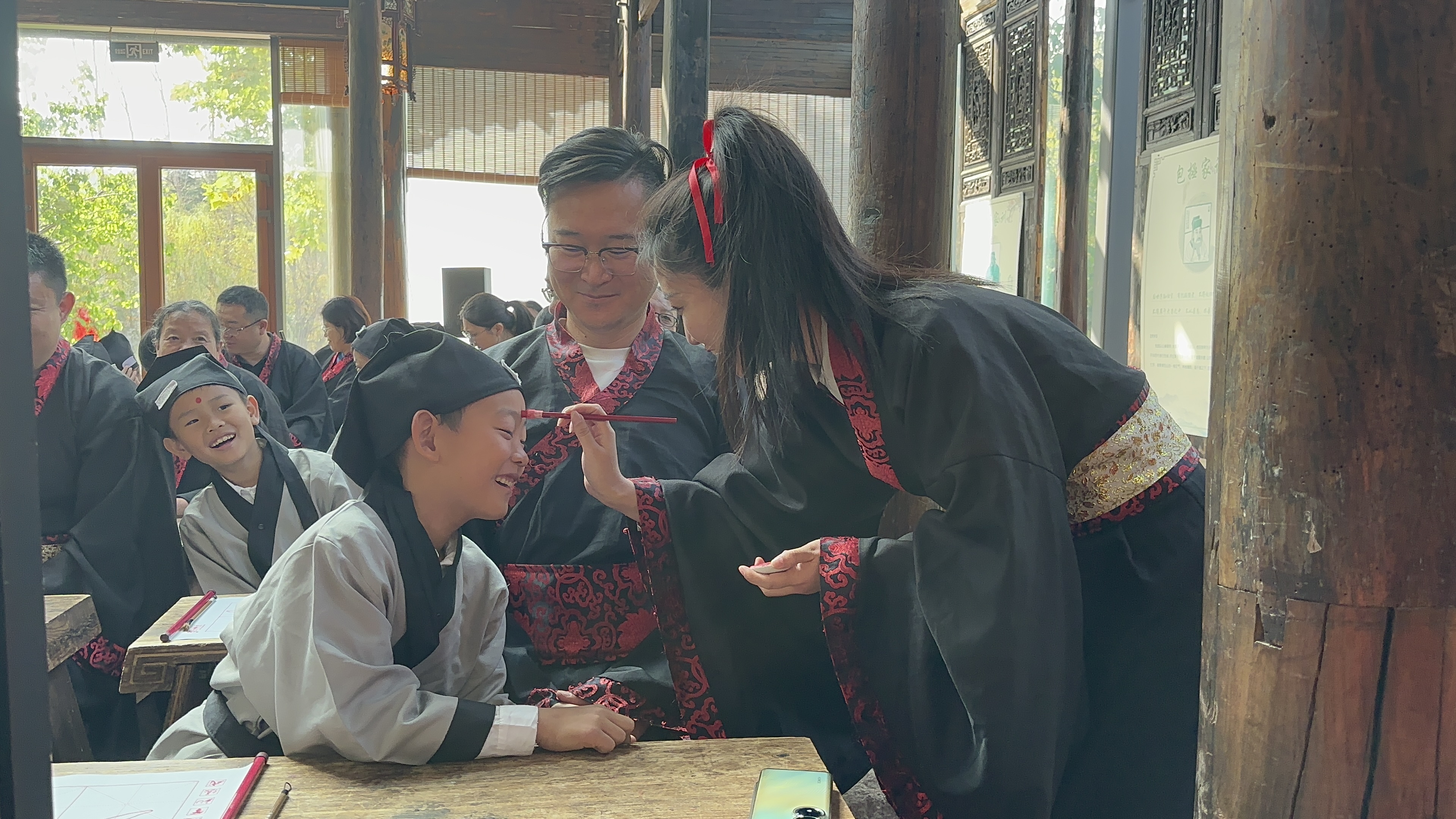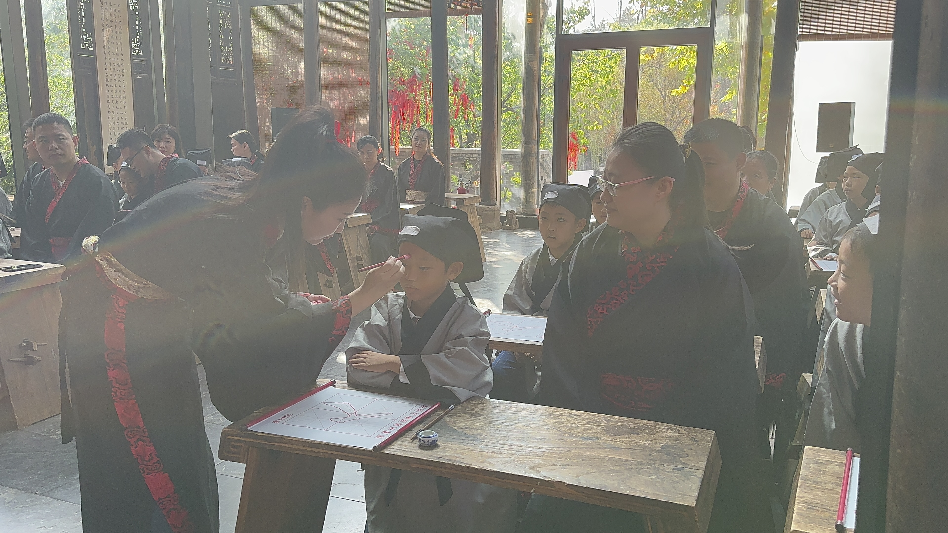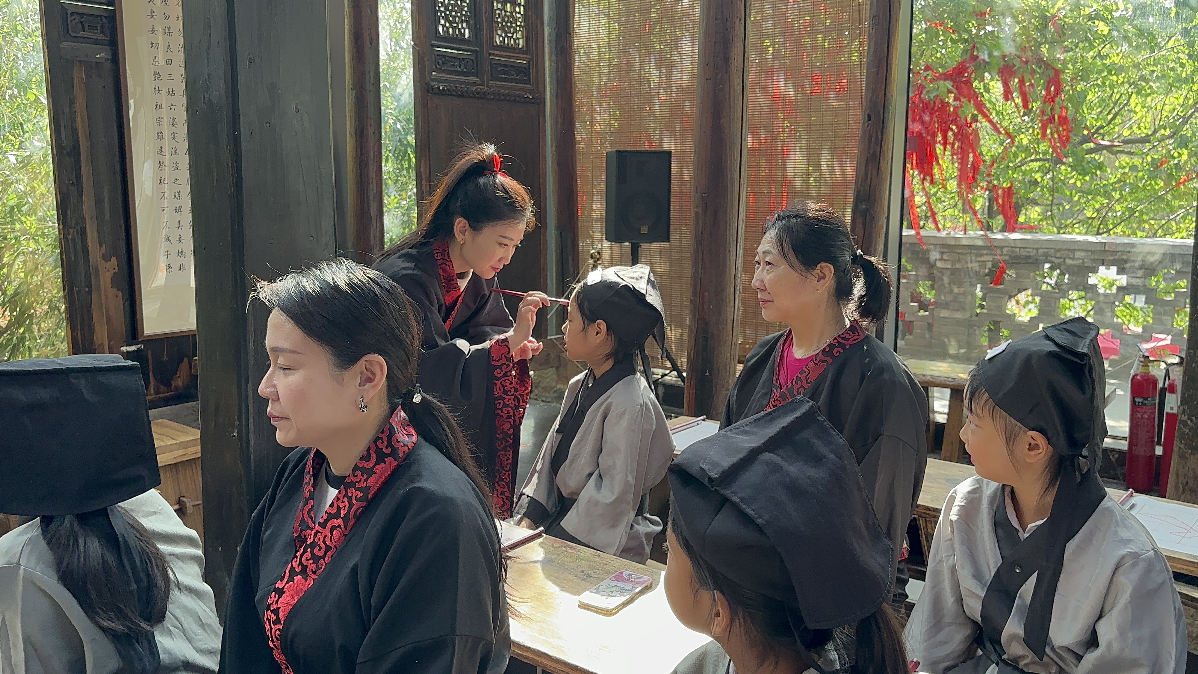 “正衣冠!“伴随书院导师的指令,队员们举起小手由上而下认真整理起来,稚嫩的脸庞写满专注,接下来队员们依次向父母、老师行揖礼,感谢父母,感谢师恩,中队辅导员仇老师为队员们朱砂启智,祝福孩子眼明心明,读书开智。