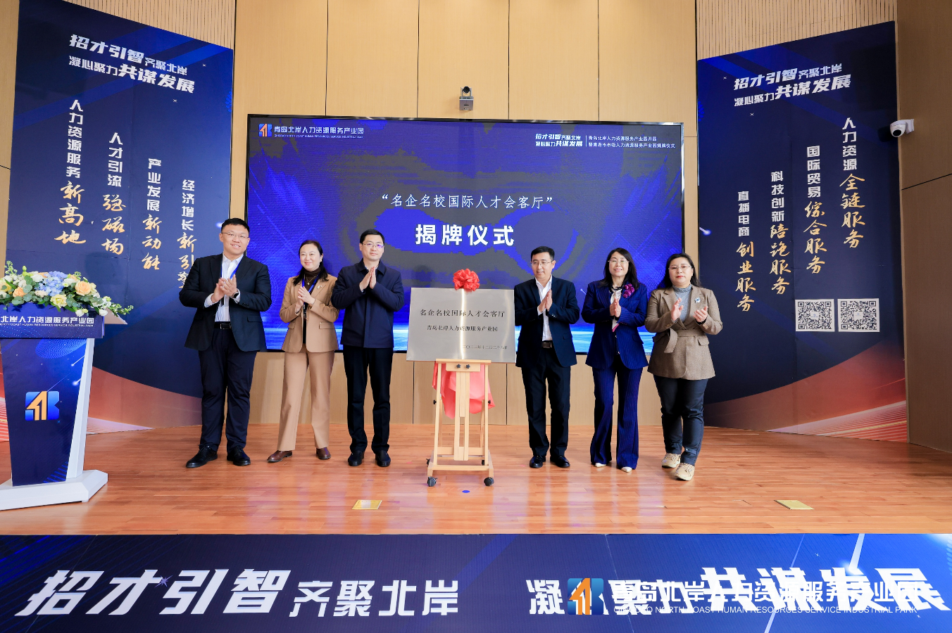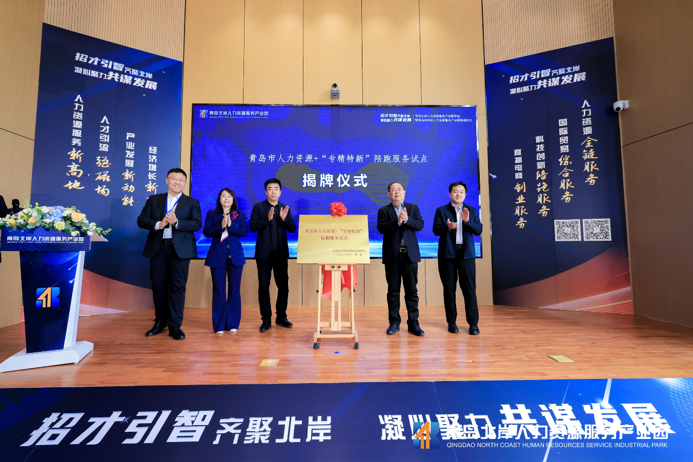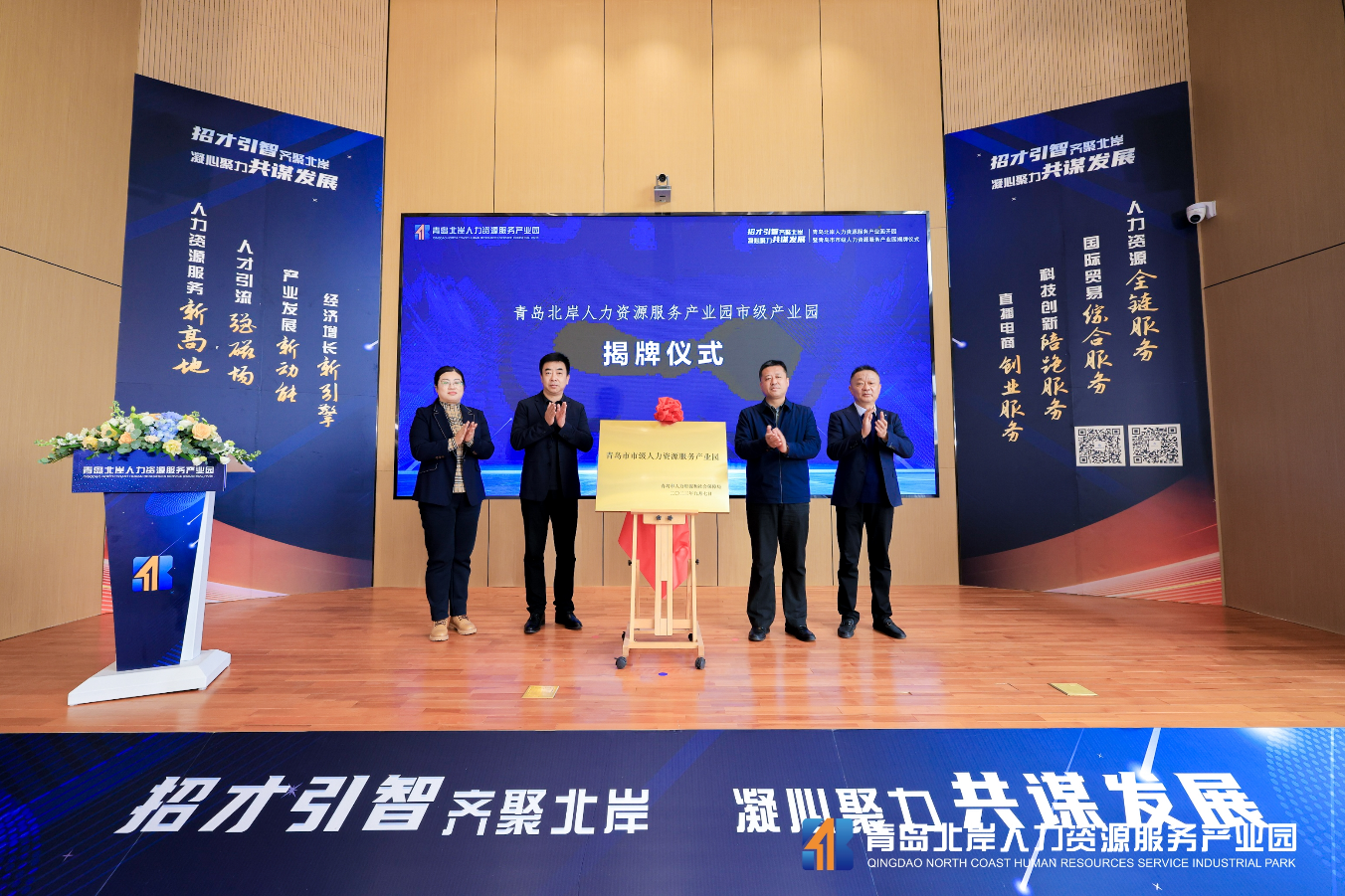 开园仪式启动后,青岛市人社局和区人社局、棘洪滩街道有关负责同志为园区 “青岛市市级人力资源服务产业园”揭牌。同时,由青岛市人社局颁发的“青岛市人力资源+‘专精特新’陪跑服务试点”的揭牌活动,也在城阳区工信局、国家高速列车技术创新中心等有关单位负责同志协助下顺利完成。