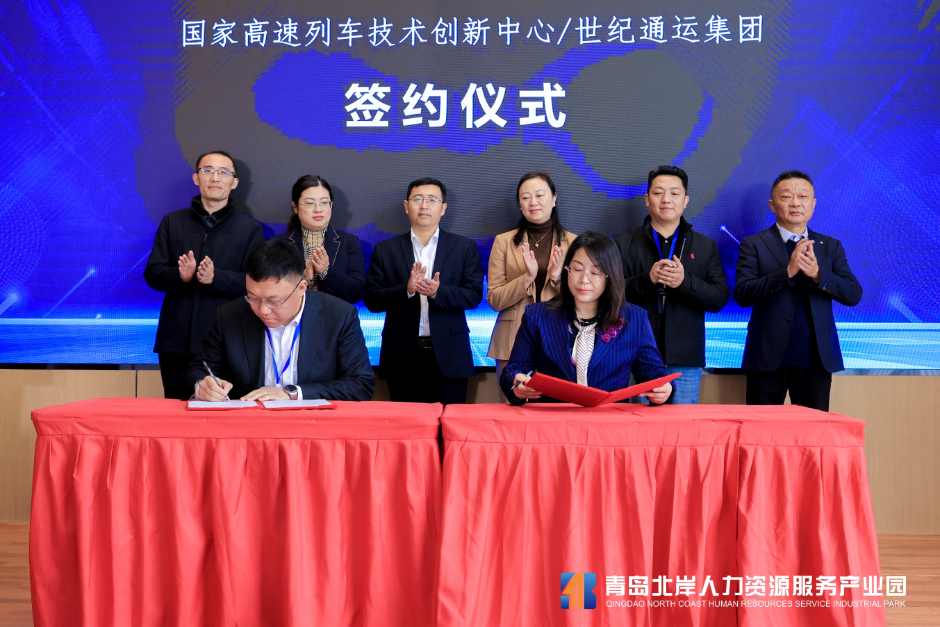 为更好地服务龙头企业,助力产业链的提速发展,通运集团与国家高速列车创新中心基于双方的优势,达成战略共建产业加速项目意向,将联手围绕高层次人才引进、创新创业人才服务、政策咨询、产业研究、科创投资、企业孵化、产业加速等领域开展深度合作,为产业链中小型企业陪跑服务,为产业链发展深度赋能。基于产业链人才链的缺乏现状,青岛北岸人力资源服务产业园联合深圳蜂群产服集团、深圳弘利、国家高速列车创新中心联合打造了“名企名校国际人才会客厅”项目,将为产业链龙头、科技型企业的高层次人才引进提供赋能服务,亦将为企业科技创新及成果产业化转移提速加码。活动仪式上,青岛市人社局、城阳区人社局、城阳区科技局等相关负责人为“名企名校国际人才会客厅”揭牌,并见证了世纪通运集团与国家高速列车创新中心战略合作协议的签署。
