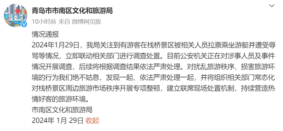 2024年1月29日,我局关注到有游客在栈桥景区被相关人员拉票乘坐游艇并遭受辱骂等情况,立即联动相关部门进行调查处置。目前公安机关正在对涉事人员及事件情况开展调查,后续将根据调查结果依法严肃处理。对扰乱旅游秩序、损害旅游环境的行为我们绝不姑息,发现一起、依法严肃处理一起,并将组织相关部门常态化对栈桥景区周边旅游市场秩序开展专项整顿,建立联席现场处置机制,持续营造热情好客的旅游环境。