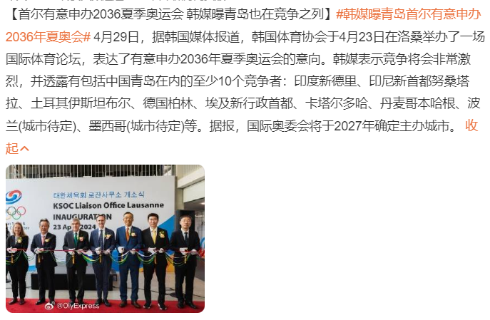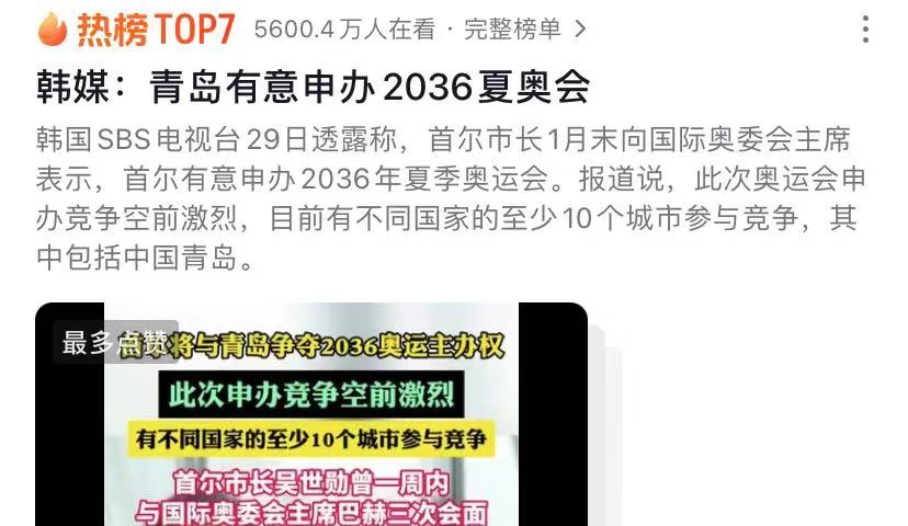 4月29日,青岛申办奥运会的消息,经由韩国媒体报道,成为热门话题,“#韩媒曝青岛首尔有意申办2036年夏奥会#”冲上热搜,引发网友热议。