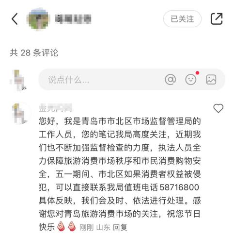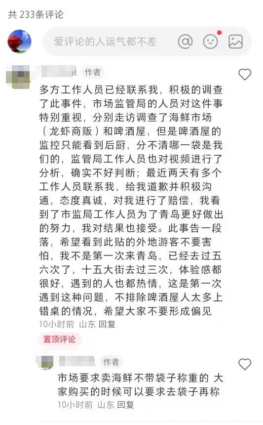 5月4日,发帖人在评论区表示:“态度真诚,对我进行了赔偿,我看到了市监局工作人员为了青岛更好做出的努力,我对结果也接受。”“我不是第一次来青岛,已经去过五六次了,十五大街去过三次,体验感都很好,遇到的人也都热情,希望大家不要形成偏见。”