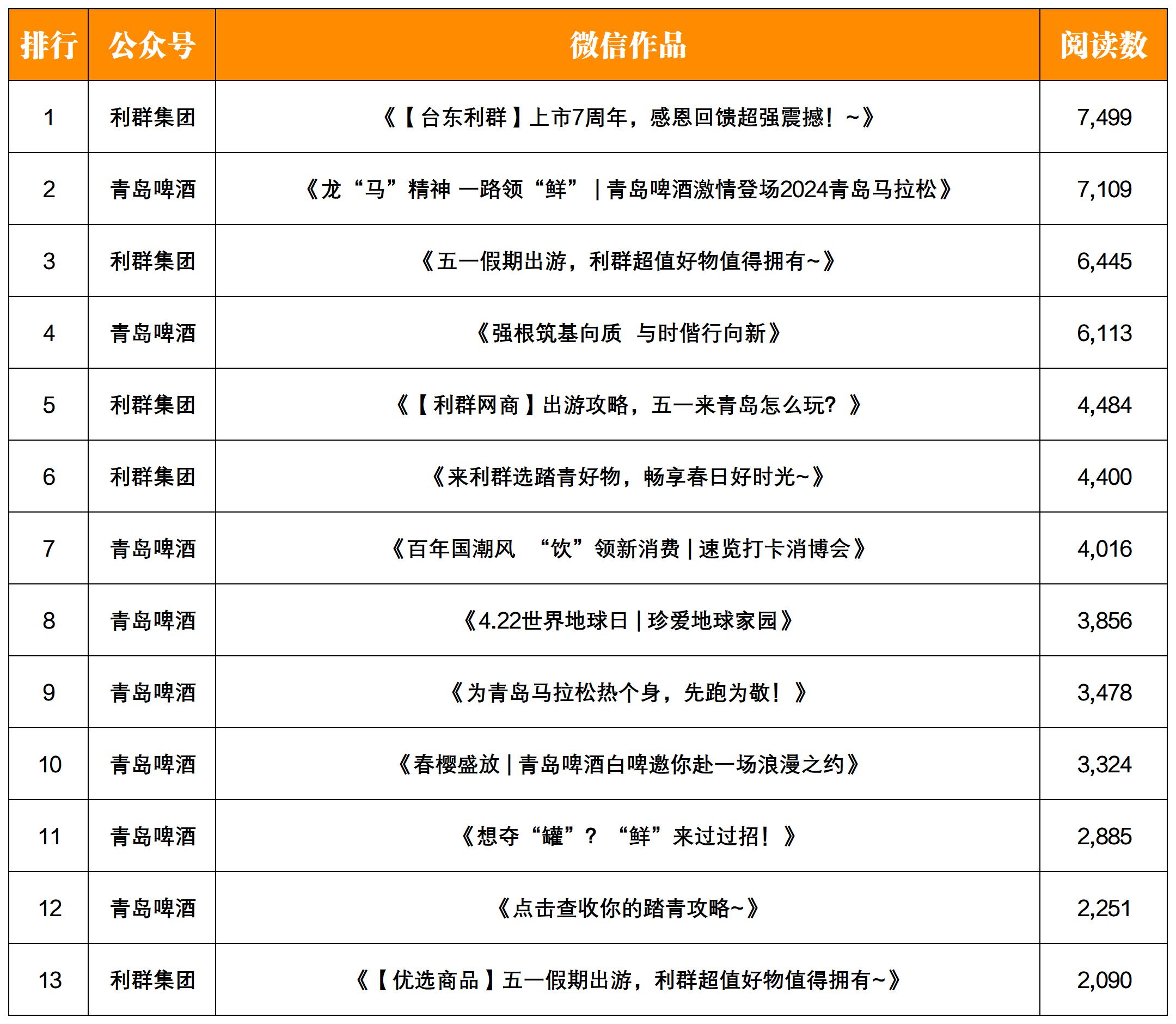 “利群集团”4月份发布文章27篇,总阅读数4.8w+,经过两期后又再次夺得榜单冠军;“青岛啤酒”4月份发布文章10篇,总阅读数3.6w+,位于榜单亚军;“琅琊台集团”4月份发布文章18篇,总阅读数1.2w+,位于榜单季军。