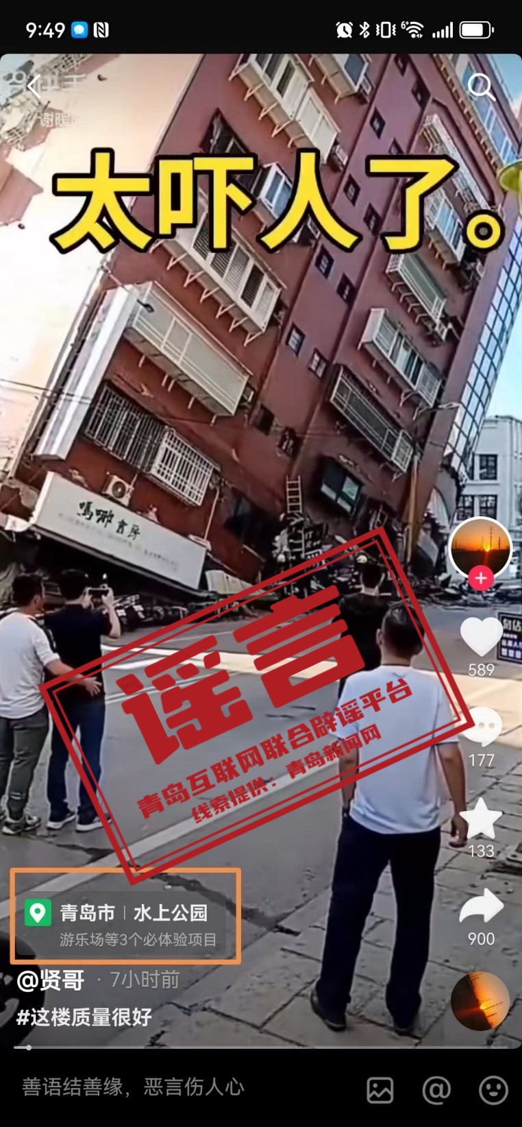 5月31日,名为“贤哥”的网友在抖音平台发布题为《太吓人了》的视频,视频中建筑楼体倾斜严重,现场有消防人员积极施救。视频发布的定位显示为青岛市即墨区通济街道水上公园。画面展示的情况危险,引发网民关注。经过记者调查并向有关部门求证,此事并非发生在青岛,视频来源是台湾省花莲县4月发生地震后的视频。