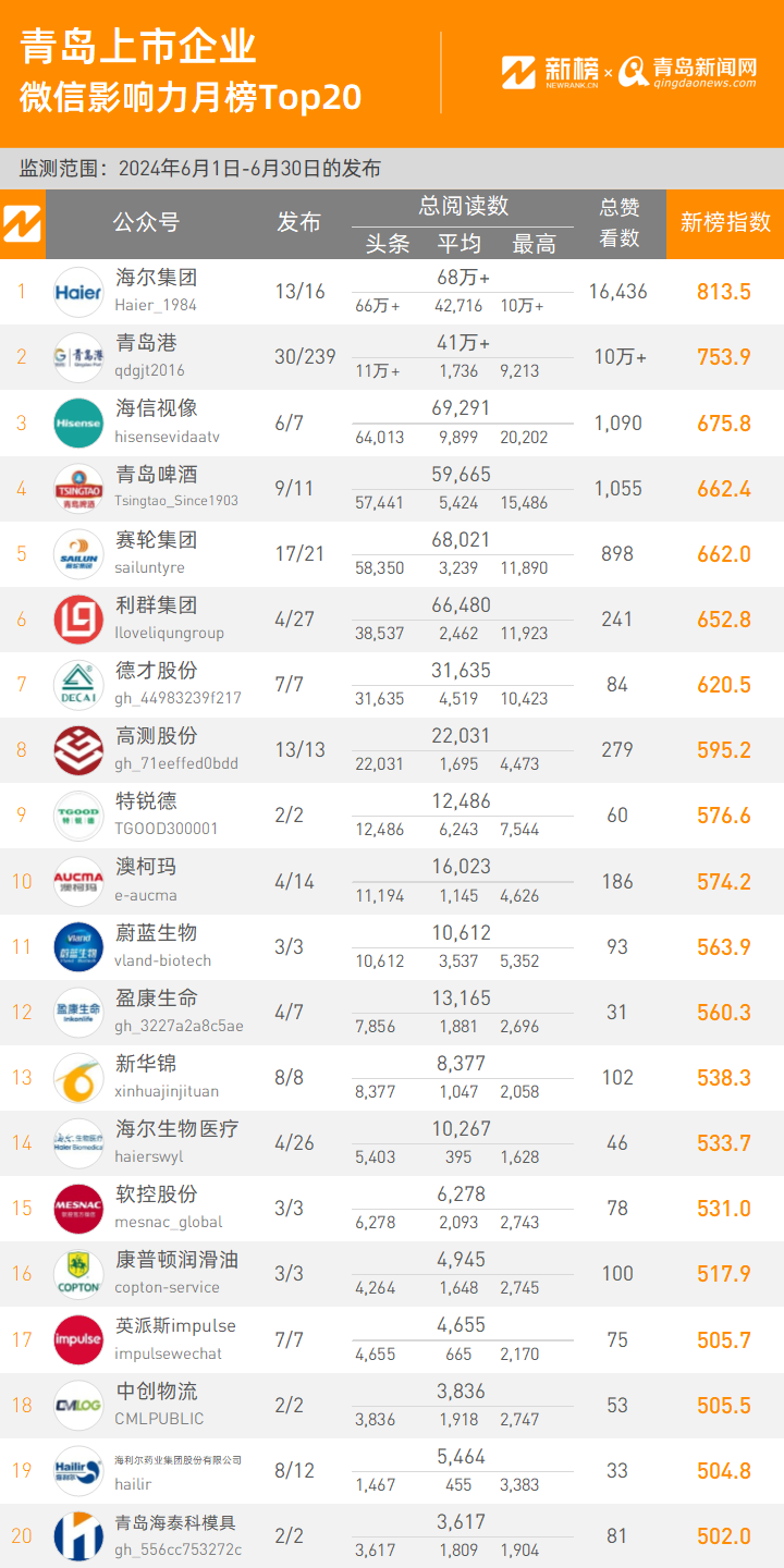 NO.3| 权威发布:2024年青岛上市企业微信影响力月度排行榜TOP20