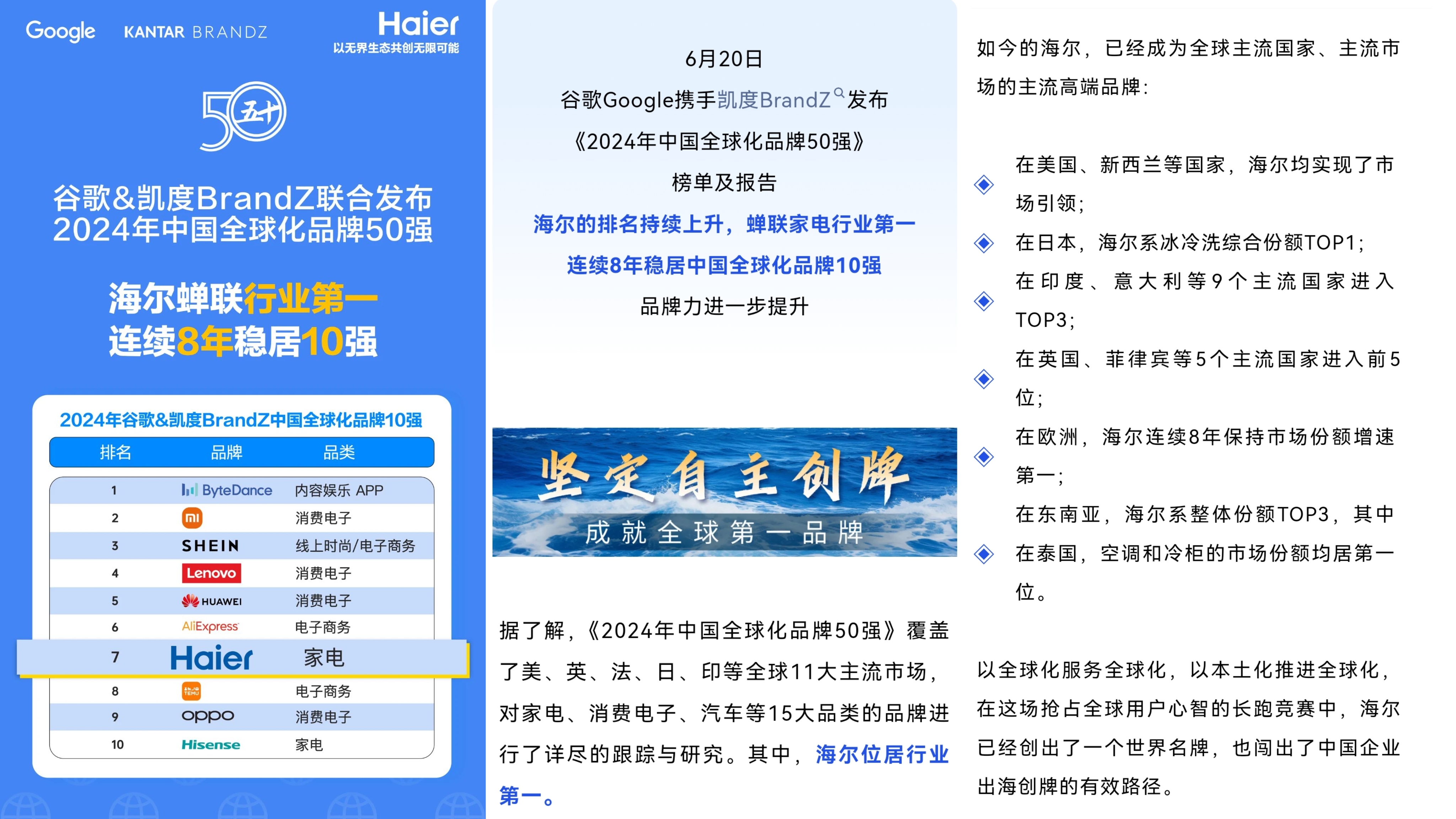 2024中国全球化品牌50强揭榜!海尔蝉联行业第一,稳居十强