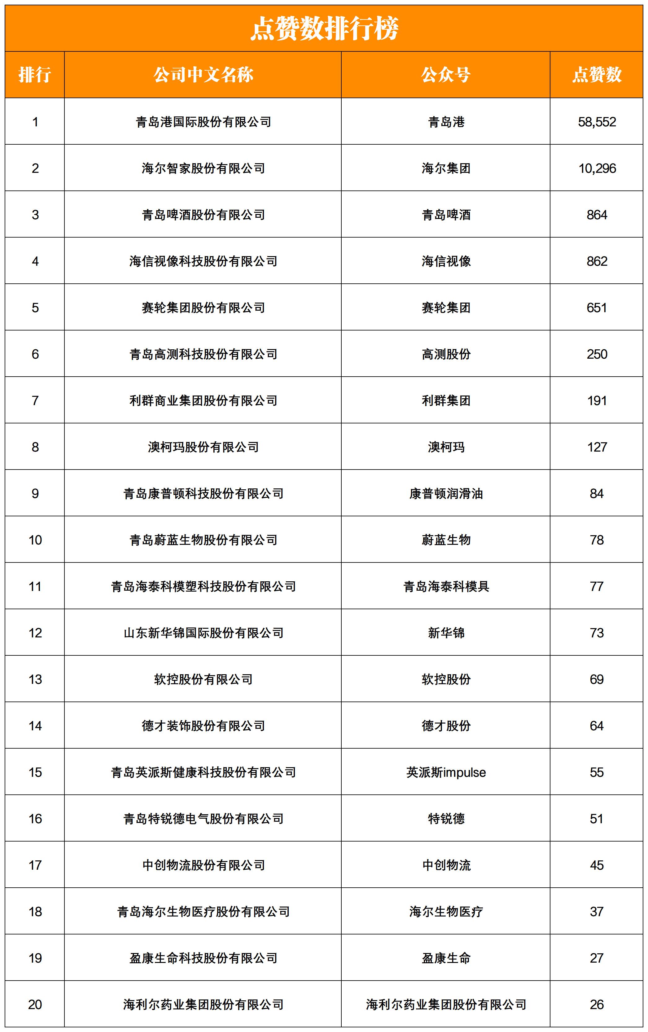 本期登上分榜单总点赞数前三的青岛上市企业是:“青岛港”、“海尔集团”、“青岛啤酒”。